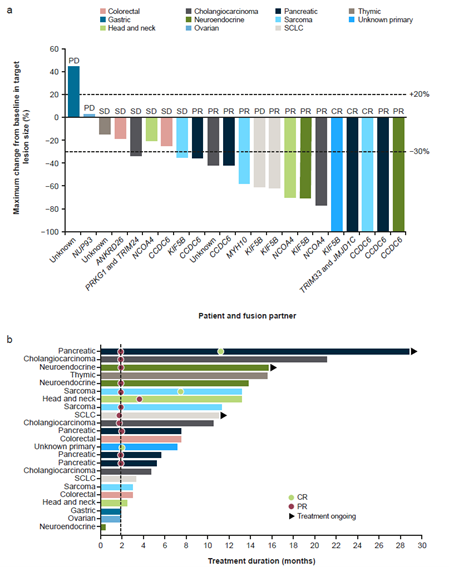 Fig. 1. Individual tumor response and treatment duration waterfall and swimlane plots for the efficacy-evaluable population. In 23 patients eligible for efficacy analyses: (a) tumor response by blinded independent central review and maximum change from baseline in target lesion size, showing each patient’s tumor type and RET fusion partner; (b) treatment duration, indicating the corresponding tumor type and the timeline for response, where the dotted line represents median time to response (1.9 months). One patient with progression based on a new site of disease did not have post-baseline assessment of RECIST target lesions, and so is not shown in Figure 1a. CR, complete response; PD, progressive disease; PR, partial response; SCLC, small-cell lung cancer; SD, stable disease.