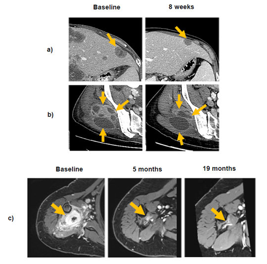 The final patient was in her early 60s, had a sarcoma and had progressed on first-line imatinib, another tyrosine kinase inhibitor, but experienced a partial response after 1.9 months of pralsetinib which evolved to an ongoing CR after 19.4 months (Figure 2c).