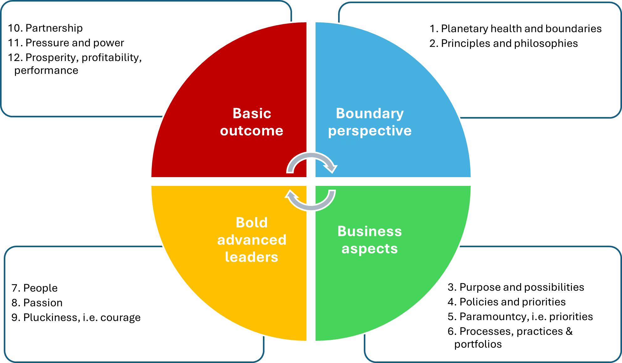 The paper also provides a strategic roadmap of 12Ps for future successors to thrive and prosper within planetary boundaries (Johannsdottir & Davidsdottir, 2024). The 12Ps are shown in Fig. 2, where one first looks at the boundary perspective, then the business aspects, followed by the traits of bold and advanced leaders, before considering the basic outcome.