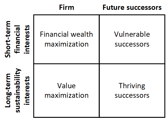 The paper argues that none of the theories discussed above sufficiently account for the negative long-term impacts of business activities on society and the environment. Therefore, the authors propose a new theoretical framework and a roadmap to emphasize and incorporate the future successor’s interests into the daily operations of businesses. The future successors as the definition indicates are the generations, both the ones living today and those not yet born, that will inherit the outcomes of businesses’ strategic directions and decisions made by current business leaders. This approach integrates the environmental constraints made by the boundaries of the planet and the sustainable development that must happen. The paper explains that by focusing on short-term financial interest and financial wealth maximization for shareholders alone will make future successors vulnerable, while long-term sustainability interests and value maximization focusing on future successors will help them thrive, see Fig. 1.
