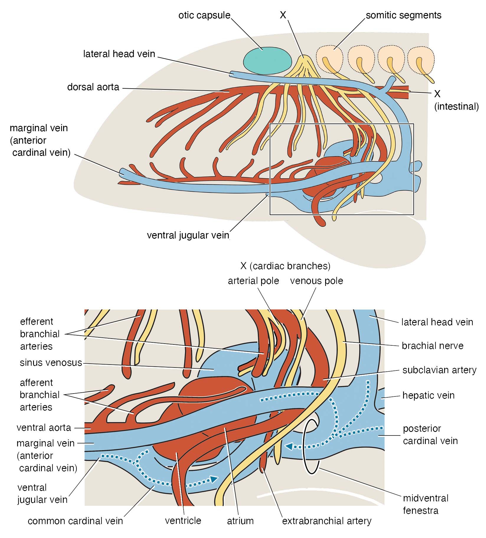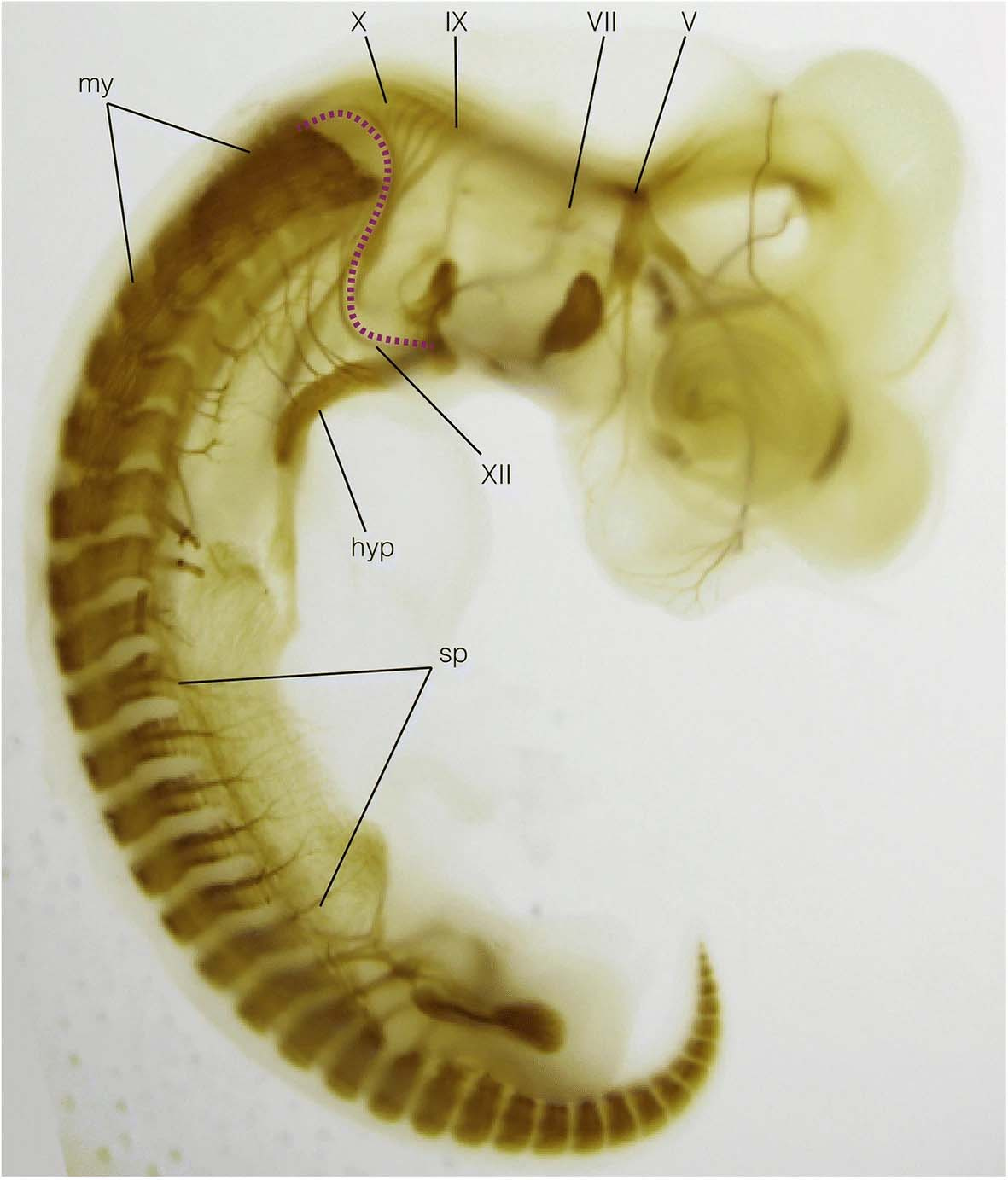 Our head is attached to the torso in a very complex fashion. The neck and throat bridge these two regions; the shoulders provide an anchoring point for these muscular connections (a cantilever of the ‘bridge’); the heart is enclosed by the girdles; connected to it, arteries and veins crisscross like the underground canals of Paris; one cranial nerve (vagus) follows the esophagus and reaches out to the heart like the thread pulled out from Adriane’s hand; trunk nerves loop and bundle like the cords of your AV system to supply the neck and throat musculature and arms. Developmentally, the trunk begins along the body axis with a notochord, paraxially behind the otic capsule in a series of somites, and viscerally behind the pharyngeal arches with lateral plate and peritoneum. Many cell lineages (notably neural crest- and mesoderm-derived ones) migrate, proliferate, and differentiate across and along this S-shaped interface.