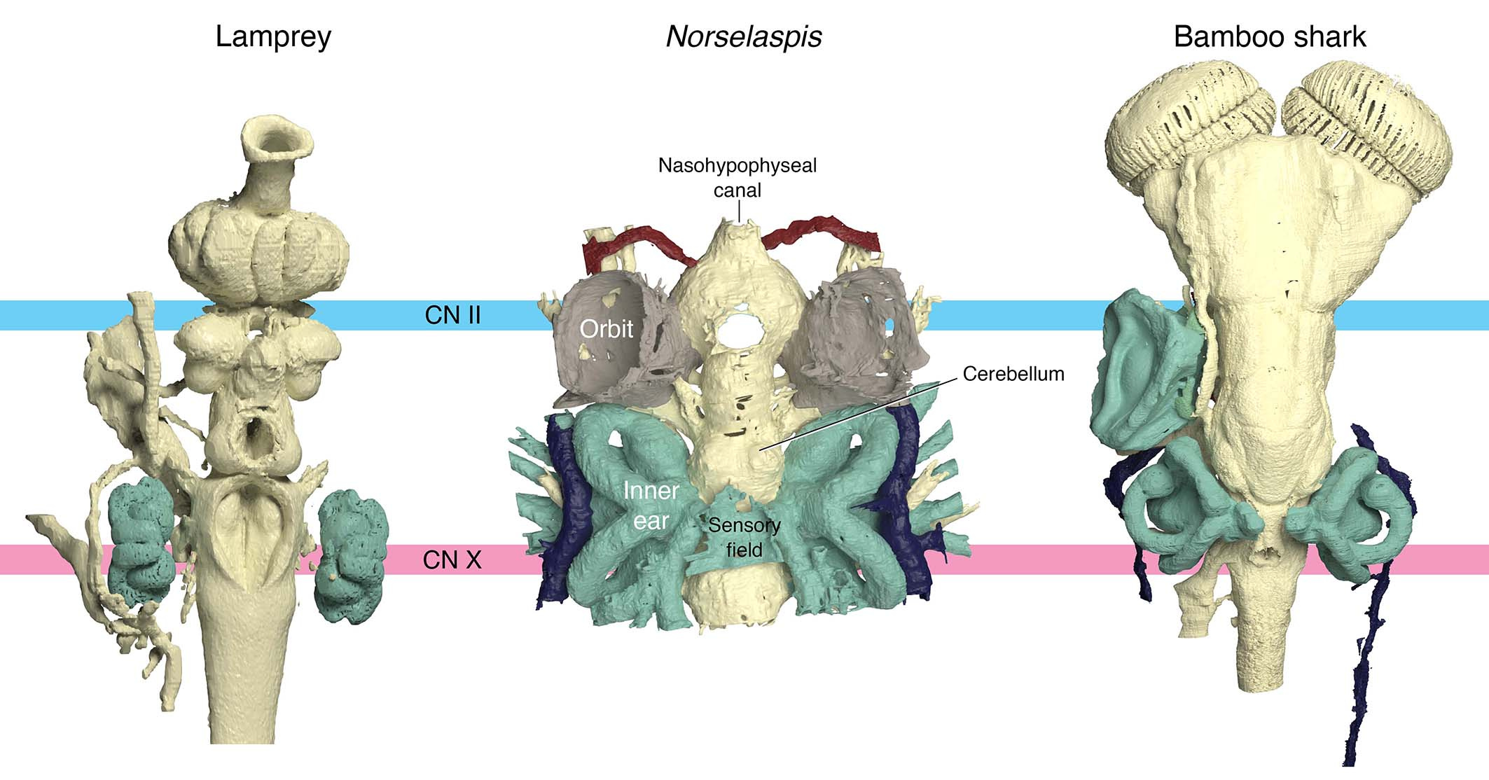 For Norselaspis, the most posterior cranial nerve (head domain) and the most anterior spinal nerve (trunk domain) are shown. The former sends its branches to the heart and intestine.