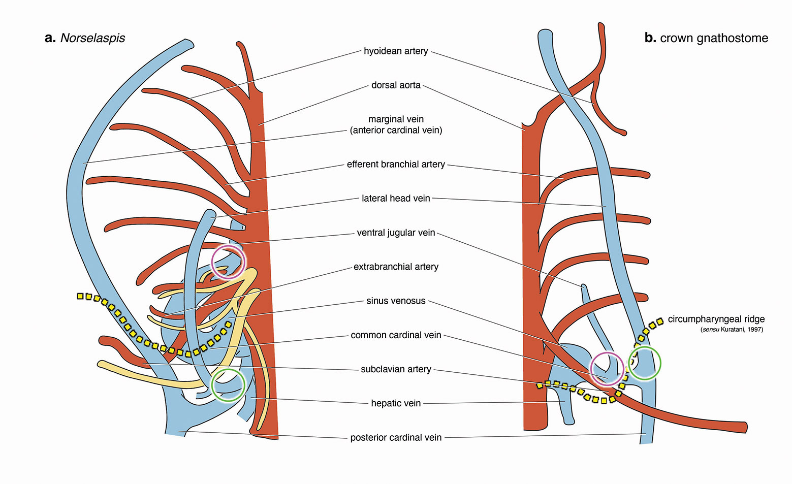 Circles indicate morphologically comparable points of venous drainage between the two forms.