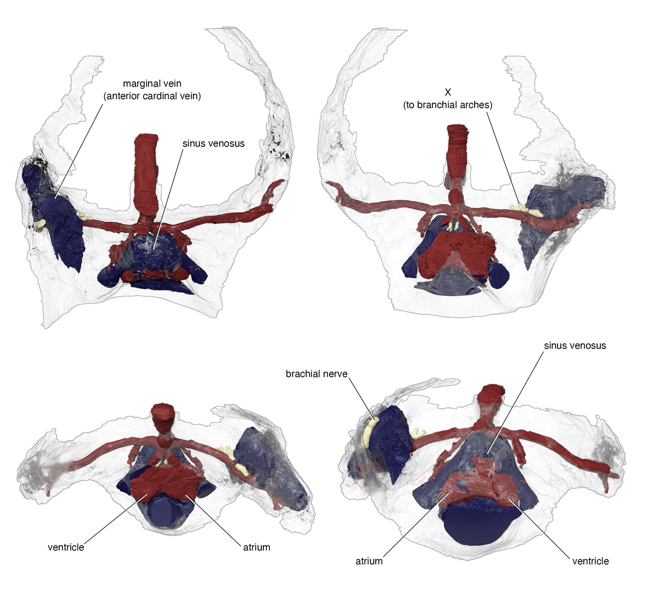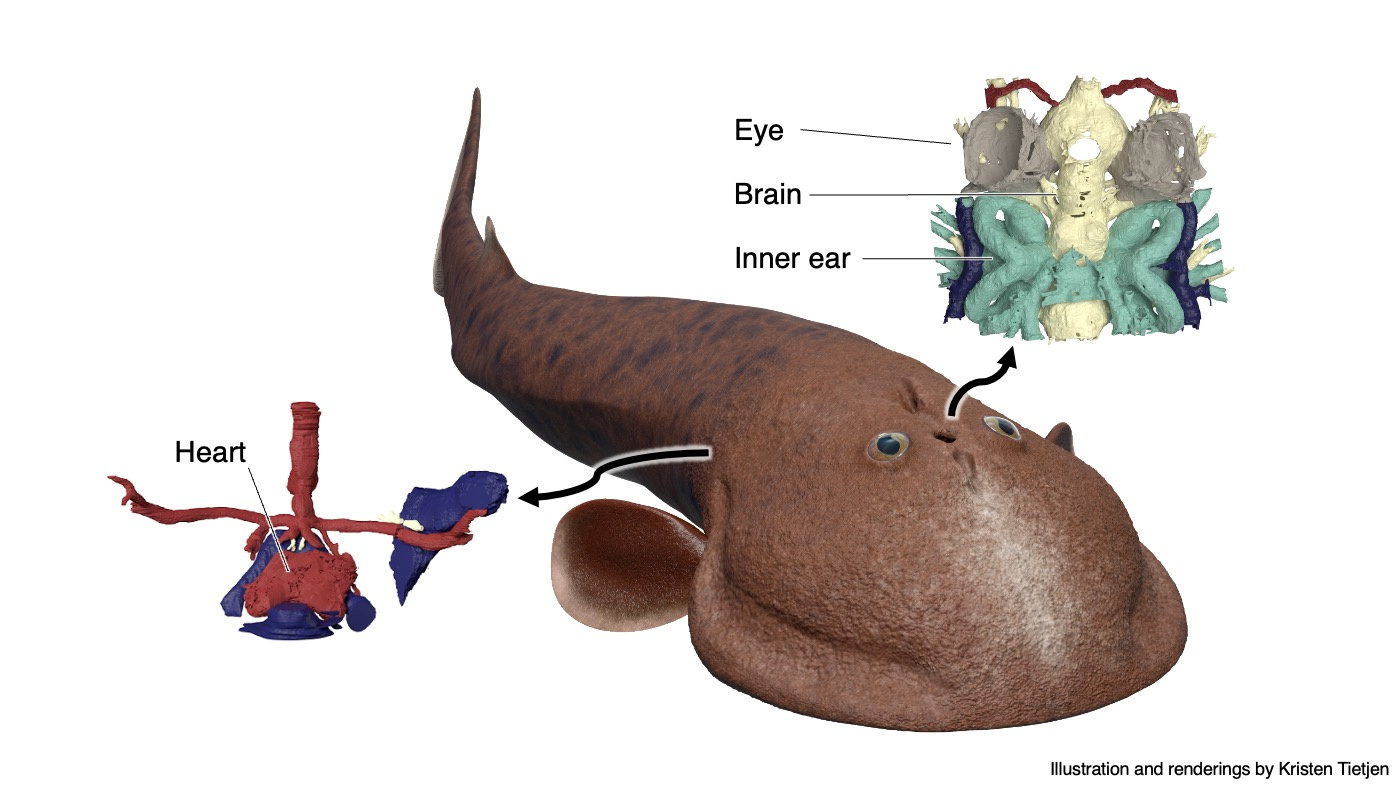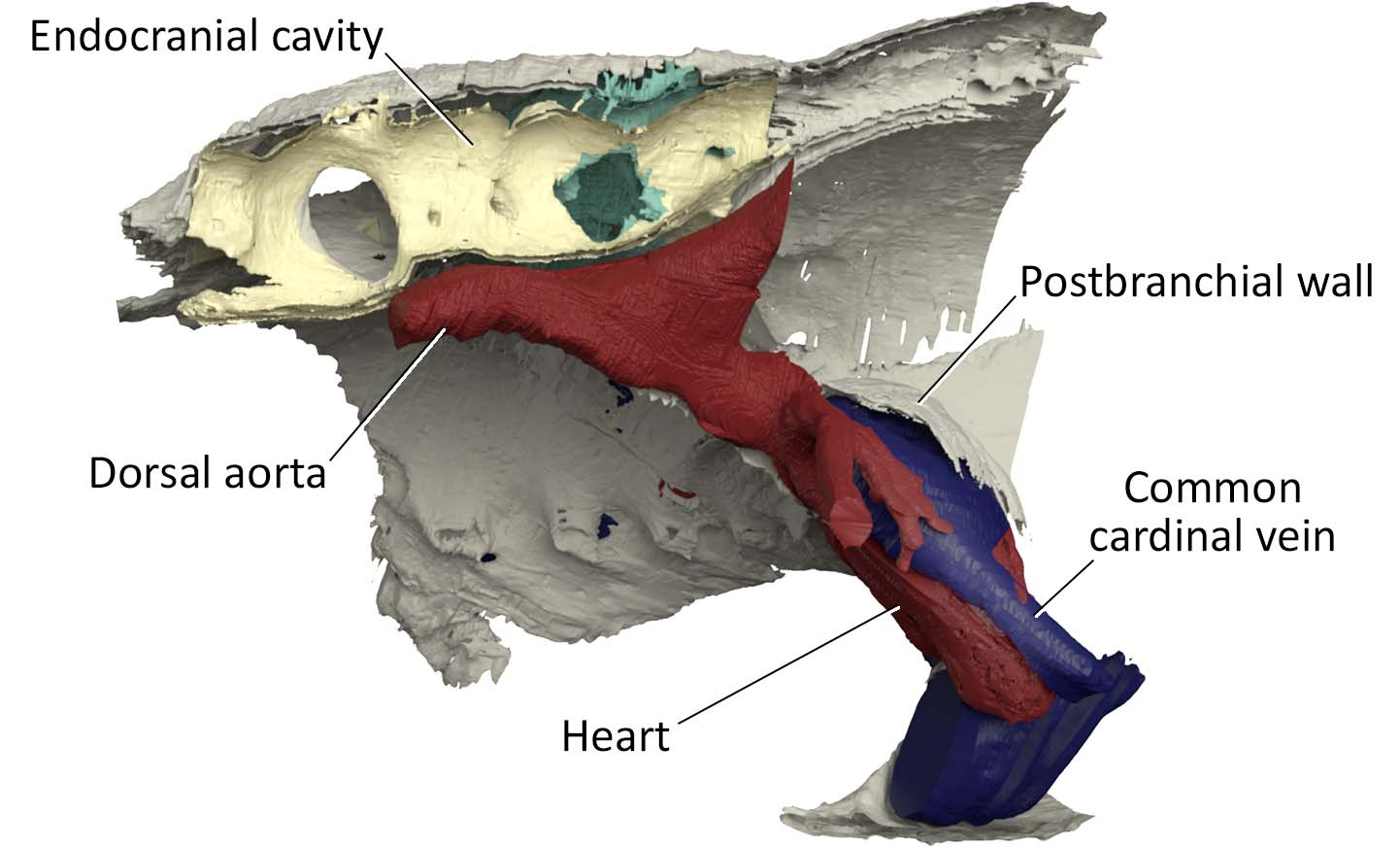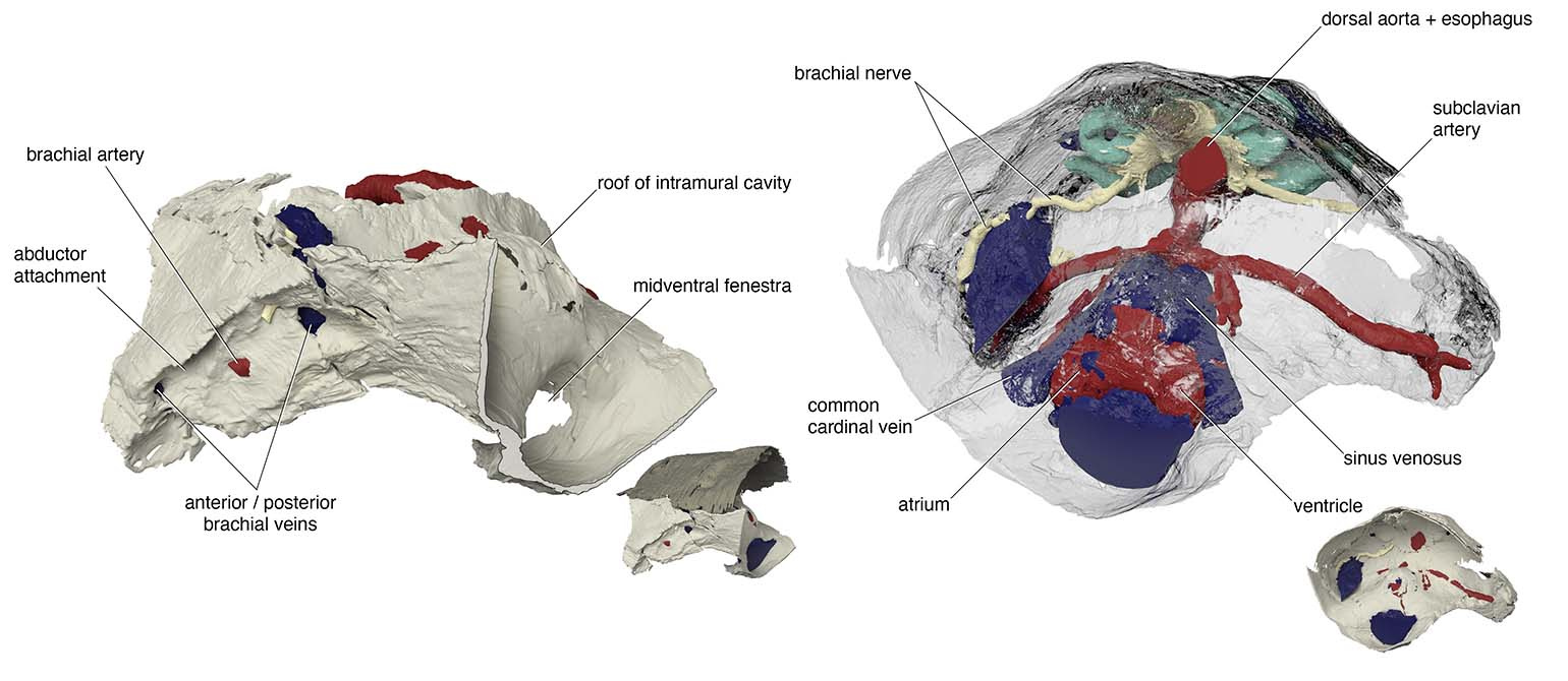 One example is the chamber that housed a heart. In the specimen used for the original reconstruction in 1981, its bony ceiling had a window, and it was interpreted that the single cardinal vein drained blood through it like in lamprey. Our scan of the new specimen revealed that this window was damage in the previous specimen, and the roof of the pericardium was completely closed. Instead, our new reconstruction showed that cardinal veins are paired between either side of the heart, draining greater volume of blood than in lamprey up to a large sinus sitting atop the heart. This drainage system is much like that of a jawed vertebrate. To describe it cheekily, I might even say that Norselaspis has a shark’s heart under lamprey’s skin.