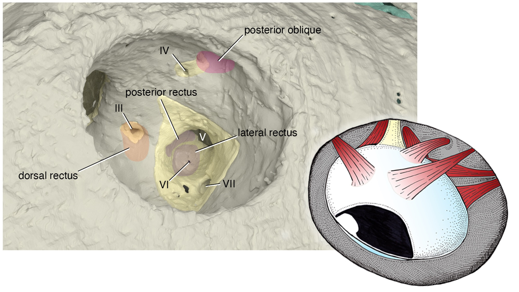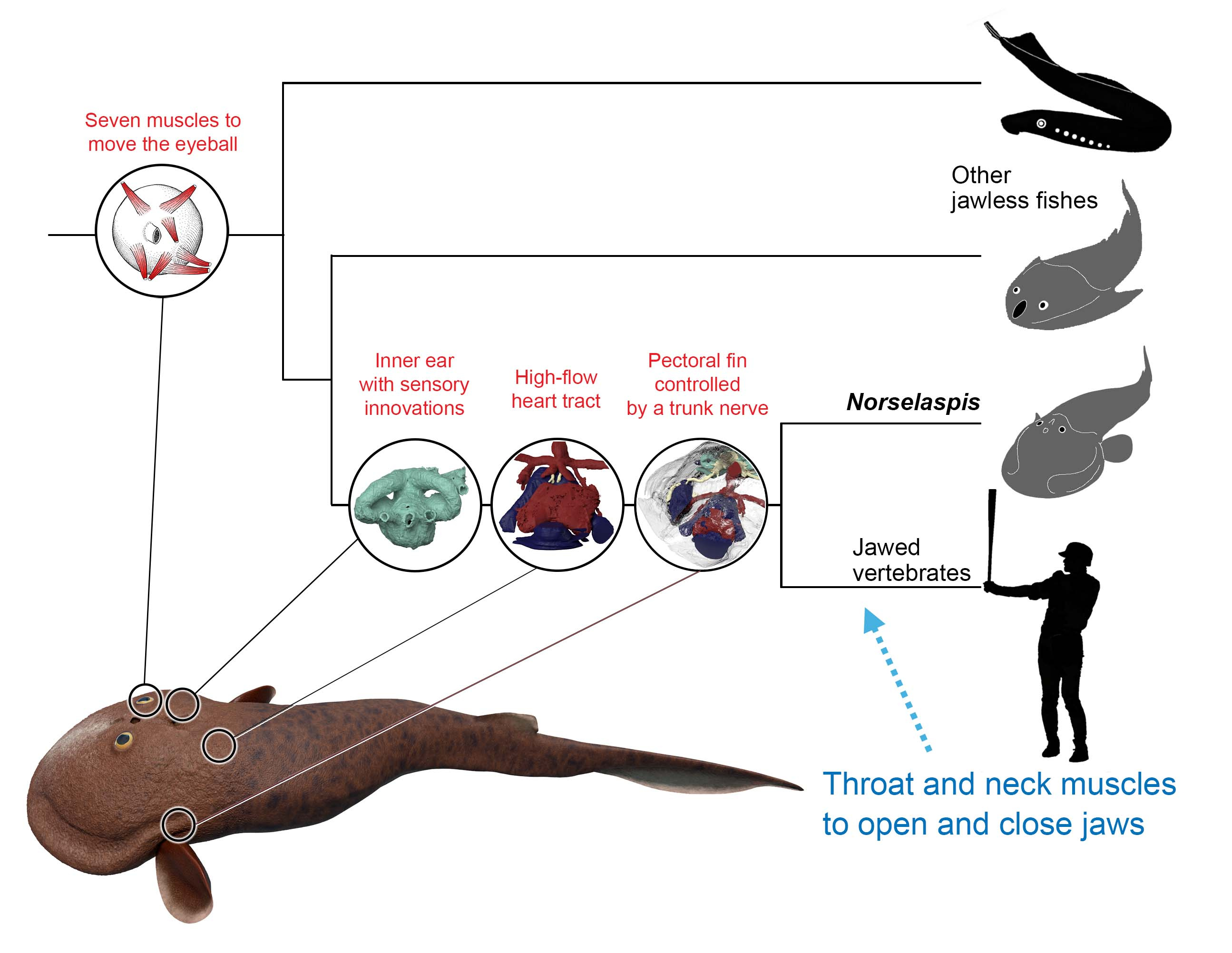 What is truly remarkable about the new reconstruction is its breathtaking resolution. The orbit of Norselaspis is only about 2 mm wide, but even at this scale we identified scars in the bone left by the attachment of extrinsic eye muscles. Nearly all vertebrates have a set of six extrinsic eye muscles, but Norselaspis has seven, as do primitive jawed vertebrates. This discontinuity generates a new hypothesis that vertebrates ancestrally had seven eye muscles, but lampreys and jawed vertebrates each lost one muscle. These muscles are generally considered an anatomical constant, but here the fossil record reveals their dynamic evolutionary history.