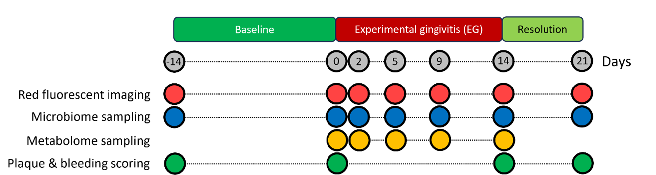 Research often compares healthy and diseased people at a single time point. However, the dynamics of the oral microbiome composition and salivary metabolomics cannot be investigated this way. By sampling longitudinally, we could trace how the microbiome shifts as gingivitis develops and resolves. It is well known that bacteria in dental plaque react to the compounds that they are exposed to. For example, sugar is well-known to cause dental plaque bacteria to produce acid, leading to tooth deterioration. To investigate both the oral microbiome and salivary metabolome simultaneously we sampled various areas of the oral cavity as well as the saliva at the same time points. This should allow us to observe interactions between the oral microbiome and the salivary metabolome across time, which could reveal insights into how that interaction impacts gingivitis susceptibility.