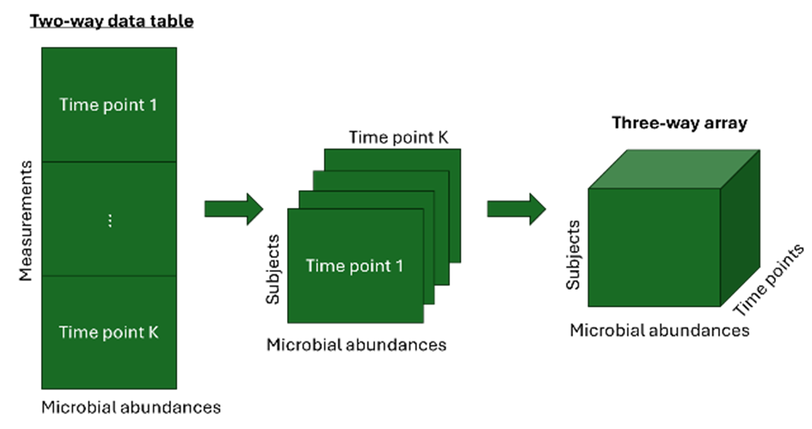 Longitudinal microbiome data is often presented as a two-way data table with measurements (i.e. one sample for every subject-time point combination) in the rows and microbial abundances in the columns. This kind of data can be converted to a three-way array by putting all measurements for each time point in the third dimension.