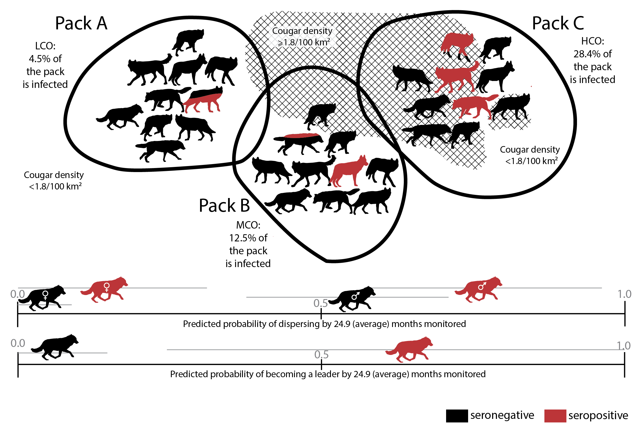 These results indicate that T. gondii serostatus can have an enormous impact on wolf behavior and population dynamics. Given wolves’ ability to affect ecosystem processes and social learning, T. gondii's effect on wolf behavior may ripple beyond the infected individuals. Seropositive individuals being more likely to disperse and/or become pack leaders may increase breeding opportunities for infected individuals. Even though vertical transmission of T. gondii (mother to offspring) is very unlikely, wolves that are leaders are usually the ones in the pack that are producing offspring, a great benefit for achieving that social position. Since T. gondii infection influences the likelihood of becoming a leader, the parasite is indirectly impacting important vital rates. We are just beginning to learn more about social learning in group living species, where knowledge is passed to conspecifics, generally from older individuals, or those in leadership positions. If wolf pack leaders are more likely to have contracted toxoplasmosis, they may lead uninfected packmates into situations where transmission risk increases or, may teach risky behaviors to uninfected packmates, without a change in T. gondii serostatus.