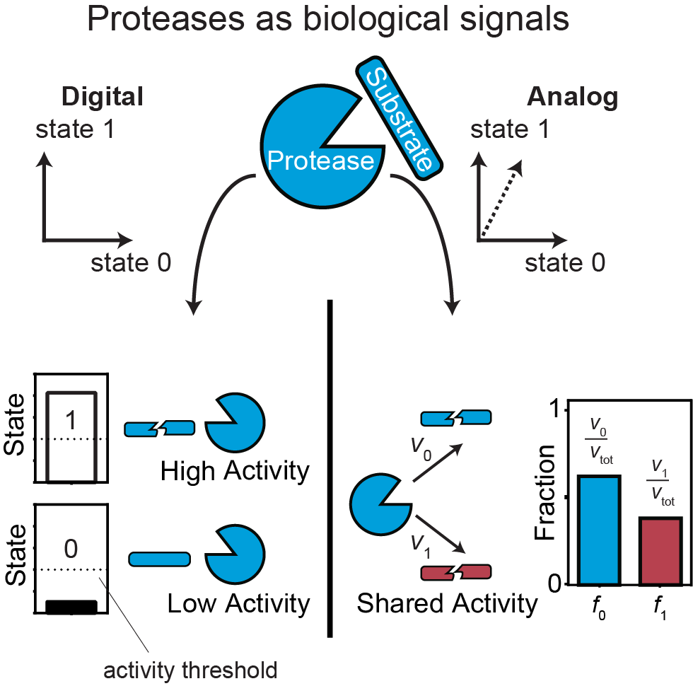 At this point in the project, we took a step back and tried to think of ways we could take activity circuits in a different direction. We realized that most biocircuits use digital logic, but far fewer have constructed purely analog circuits. After all, many biological systems are analog-in-nature, so why not apply this same logic to the circuits we use to manipulate biology? We saw how the design of quantum computers, which are analog systems, are proving useful in a number of areas where traditional, digital computers have been stuck for decades. Inspired by this idea, we imagined ways in which we could create an analog signal where proteases are dynamically partitioned between two-states. This is similar to how with genetic circuits, the cellular machinery are partitioned between the host genes and the inserted construct (i.e., shared resources). We pared down this concept down to a population of proteases that is shared between two unique substrate targets (i.e., substrate-A and substrate-B). Under this framework, the fraction of proteases devoted to cleaving either substrate is a continuous value between 0 and 1 (i.e., the signal) and this signal can be manipulated by controlling the relative concentrations of either substrate (i.e., the analog operation).