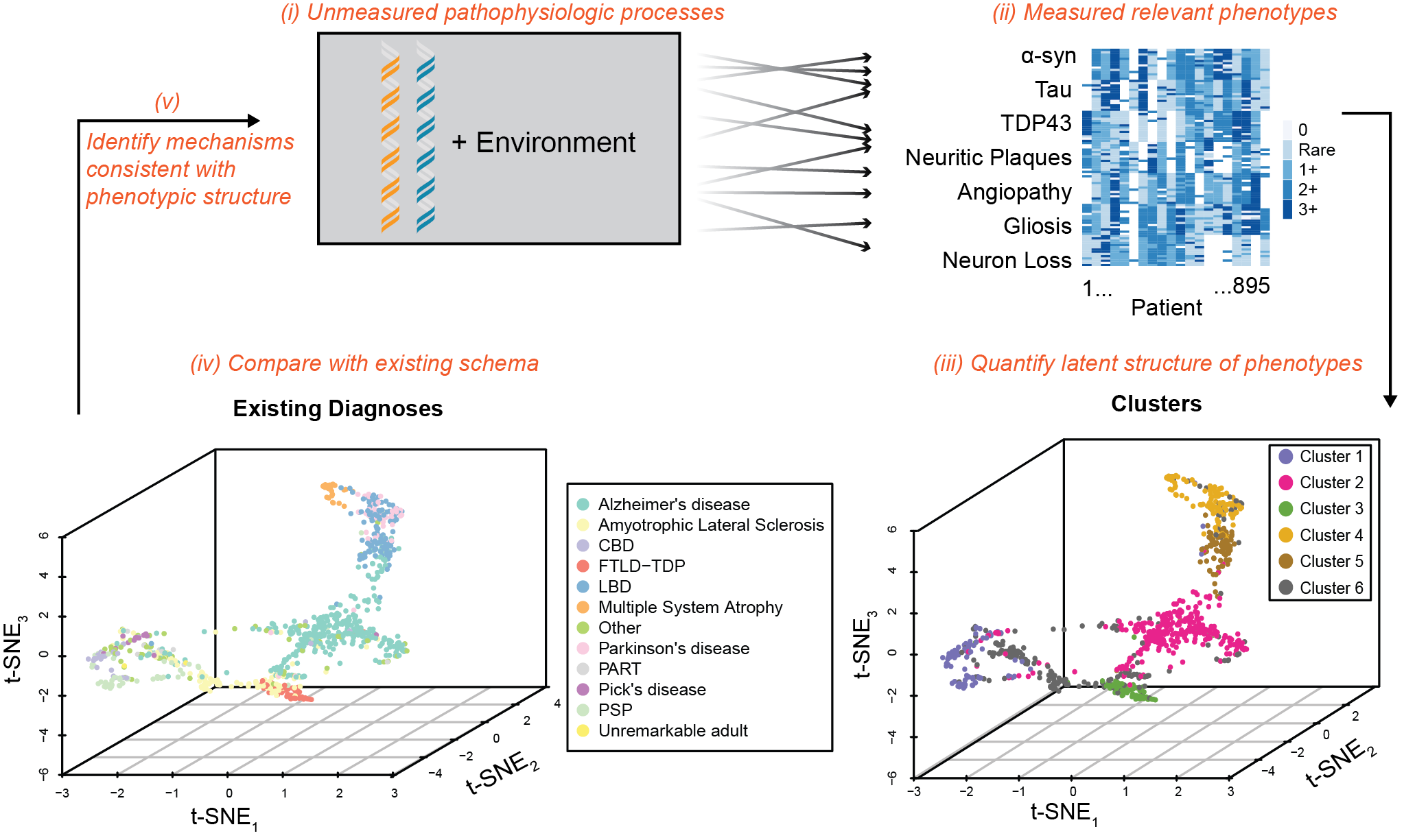 We were already familiar with pronounced phenotypic heterogeneity in psychiatry, where 50% of patients meet criteria for multiple Diagnostic Statistical Manual (DSM) diagnoses and disease mechanisms are unknown2,3. Unsupervised approaches reveal reproducible patterns of co-occurring symptoms4 and an overarching “general psychiatric unwellness” factor (p-factor)2 that may explain psychopathology more parsimoniously than the DSM. Thus, we wondered whether existing neuropathologic diagnoses truly capture demarcations in disease experienced by different patient groups, or whether alternative diagnostic boundaries would more succinctly describe the causes of neurodegeneration and identify groups susceptible to intervention (Figure 1).