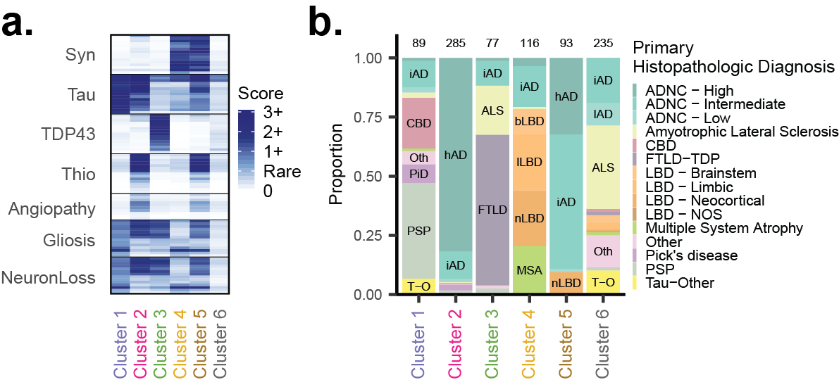 As an initial step towards answering this question, we assessed 895 autopsy cases from patients with neurodegenerative disease, each with regional measurements of tau, α-synuclein, amyloid-β, and TDP-43 aggregation. We applied a data-driven clustering algorithm to identify patterns of copathology between these proteins, revealing 6 patient groups that reflected (1) primary tauopathies, (2) combined tau and amyloid-β pathology characteristic of Alzheimer’s disease, (3) TDP-43 proteinopathies, (4) synucleinopathies, (5) tau-α-synuclein copathology, and (6) minimal cerebral pathology (Figure 2). The composition of the first 4 patient groups or clusters provides a data-driven confirmation of Table 1, but the 5th cluster’s composition suggests that tau-α-synuclein copathology may be a unique entity. Cluster 5 had strong corticolimbic α-synuclein and amyloid-β pathology, strong limbic tauopathy, and moderate cortical tauopathy. Patients in Cluster 5 had longer lifespans than patients with pure synucleinopathy (Cluster 4), suggesting that this copathology pattern might preferentially occur in more indolent synucleinopathies or protect against neuron loss.