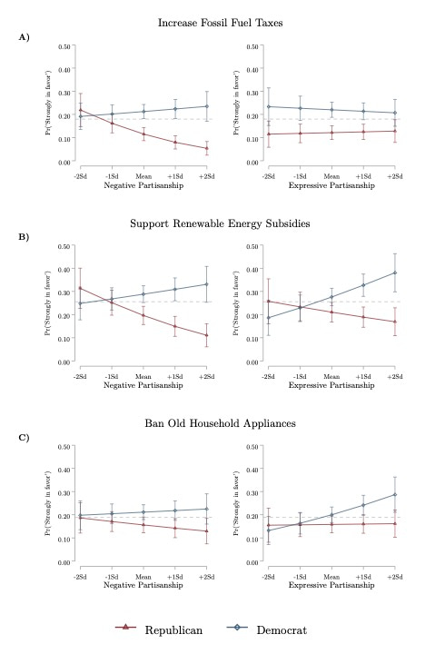 One promising finding is that the strength of partisan identity—what is often called expressive or positive partisanship—does not appear to have a strong association with climate policy preferences. That is, our results imply that a strong “Republican” identity can coexist with support for fossil fuel taxes or renewable energy taxes.