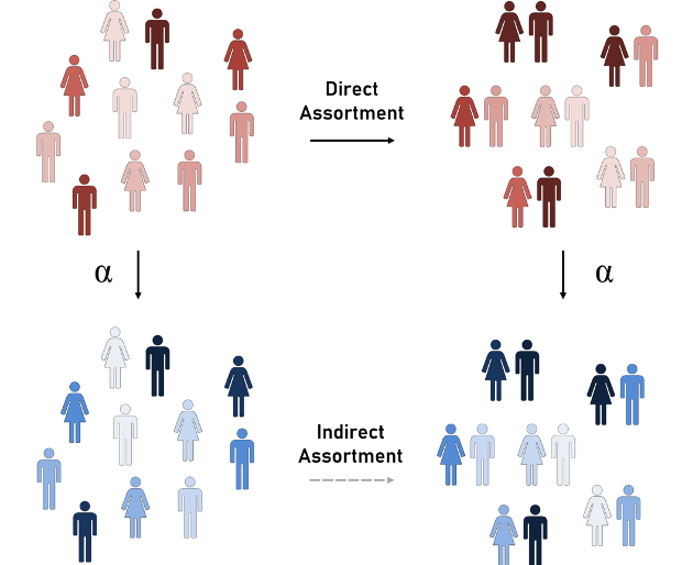 There are however other, indirect, reasons for partners being more similar. Confounding factors are social, environmental and other components that equally impact the characteristics of partners. For example, people sharing geographic location are not only more likely to form a couple, but due to the shared environment they may be exposed to similar air pollution levels, they may have easier access to university or certain sport facilities. Such couples are expected to be more similar with respect to lung diseases, education level, or physical activity levels, respectively. Such similarity is not due to choice, but due to confounding. More broadly, one has to distinguish direct and indirect assortment. Similarity for a (secondary) trait is due to indirect assortment when mate choice occurs for a primary trait, which is correlated or causal for the secondary trait. For example, partner similarity for body mass index (BMI) is partly due to a primary mate choice for educational attainment, which impacts BMI and hence increases similarity in terms of BMI as well.