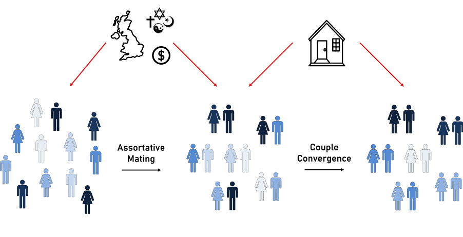 In summary, our results illustrate the different mechanisms contributing to the similarity between partners. These analyses revealed how direct assortment combined with confounding and indirect assortment can give rise to the observed partner similarity.