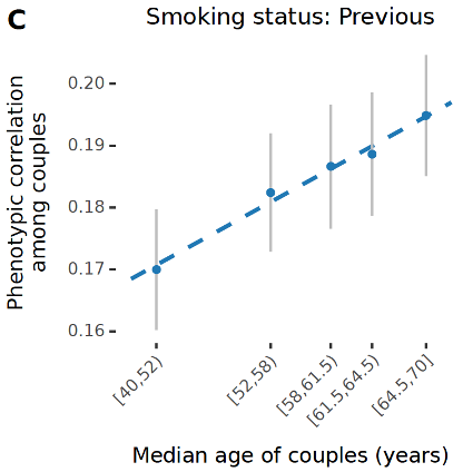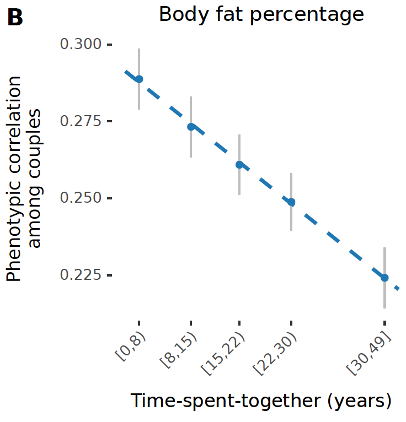 Partners resemble more to one another than randomly sampled pairs. For example, partners tend to be similar with respect to various anthropometric measures (body mass index, height), socioeconomic factors, behaviours (religious views and social attitudes), lifestyle (diet, smoking habits, hobbies), and even disease risk. However, it is currently unclear what exactly causes this similarity. It is known that the major contributor to the phenotypic similarity is partner choice: people actively look for partners who are similar to them, a phenomenon known as assortative mating. However, once couples are formed partners influence each other and become increasingly similar over time. This latter phenomenon leads to partners converge further as they age.