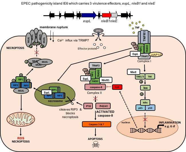 Figure 1. EPEC harbours a particular pathogenicity island that carries the genes encoding 3 type III effectors, EspL, NleB1 and NleE. Each of these effectors displays novel enzymatic activity and shuts down critical host innate immune responses including NF-κB signaling (inflammation/survival), apoptosis and necroptosis during infection. This schematic is a representation of the host proteins targeted by EspL, NleB and NleE within the TNF signaling cascade.