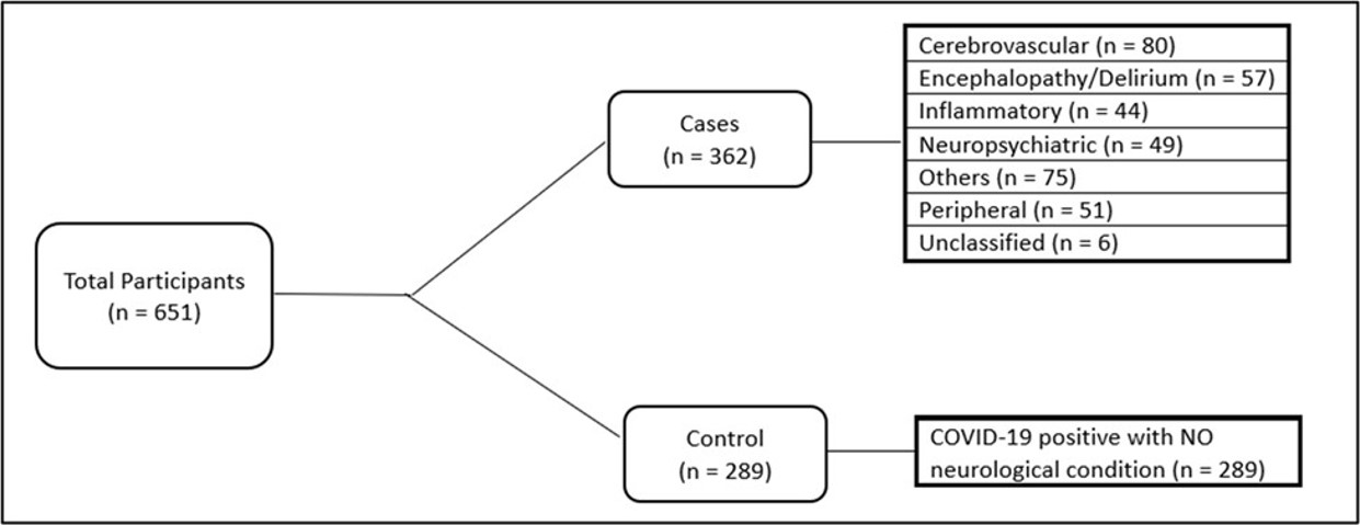 Hospitalised adult patients (aged >16yrs) were recruited into the COVID Clinical Neuroscience Study (COVID-CNS) in the UK if they met the WHO criteria for definite or probable COVID-19. Cases were defined as those who developed a new neurological or psychiatric diagnosis in association with COVID-19 and were classified by specific diagnostic criteria as per established Clinical Case Definitions. Controls were defined as those without new neurological or psychiatric diagnoses, and control recruitment was targeted to match the cohort of cases for age, sex, premorbid Rockwood clinical frailty score, and epoch of the COVID-19 pandemic in the UK.