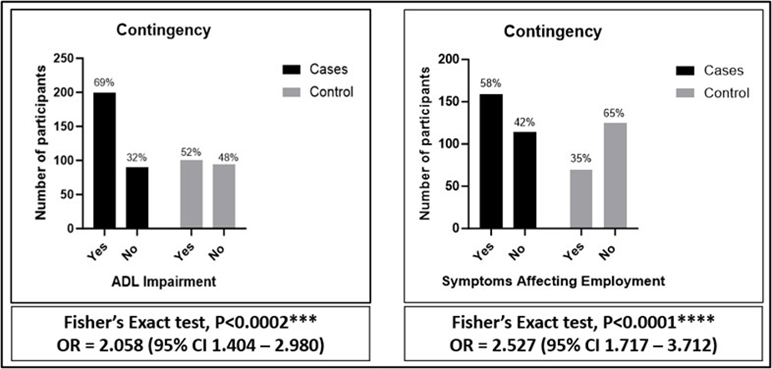 A higher proportion of cases than controls had impairment in ADLs at follow-up at the median interval of 13-16 months . Cases were also more likely to report symptoms that impacted employment than controls and a higher percentage had become unemployed following discharge. There was no significant difference in the time from discharge to completing the follow-up assessment at a median interval of 13-16 months, or the proportion with an GAD-7 or PHQ-9 scores >5 between cases and controls overall.