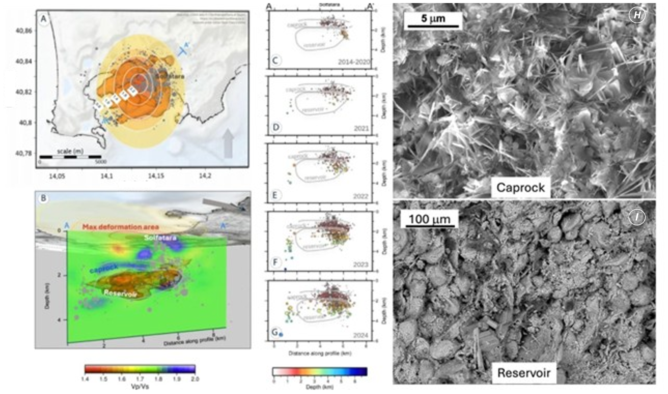 Just beneath the surface lies a tough, fibrous caprock layer stretching from about 1 to 2 kilometers deep. Spatial and temporal correlations in the evolution of seismicity reveal that this structural element of the caldera is the first to fail (Figure 1, Panels A-G), producing small-magnitude, shallow earthquakes. This arch-shaped horizon, formed from naturally cemented volcanic products, functions as a pressure lid, trapping H2O and CO2 below. Previous and parallel laboratory experiments on site-relevant core samples reveal that this caprock is reinforced by microscopic mineral fibers (Fig. 1, panel I), similar to those used in advanced engineering materials, which enhance its toughness and flexibility. Notably, beneath the Solfatara crater at shallower depth, rocks become saturated with water-steam and CO2, reflecting the upward movement of hot fluids – a key component in the caldera’s long-term behavior.