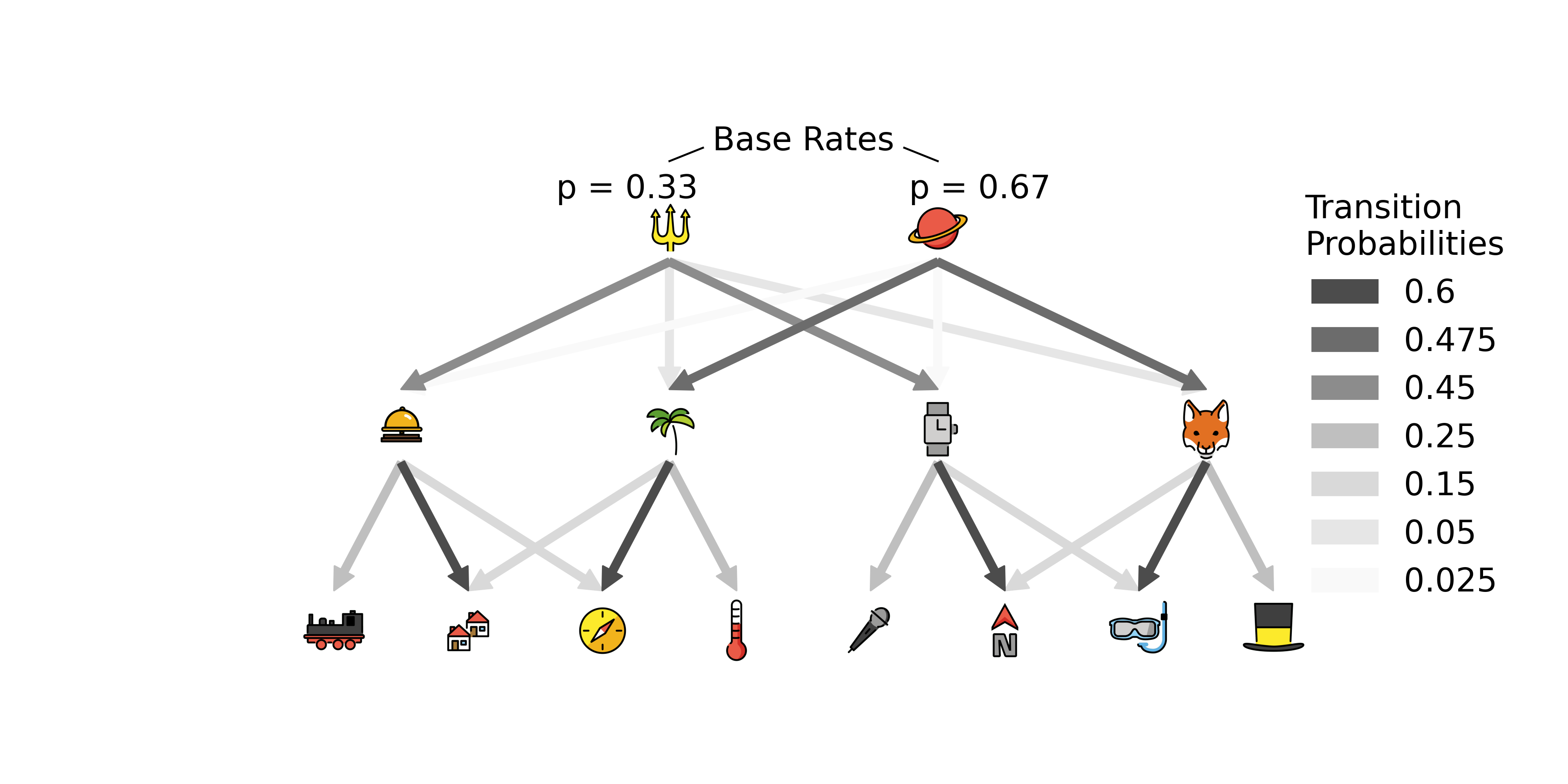 To test our hypothesis in human participants, we created a series of tasks that manipulated the ratio of past to future states. A “state” here was signified by a unique emoji (like a trident in the figure below) presented on a computer screen. The task involved subjects learning how emojis probabilistically led to new emojis over many trials. Because only backward but not forward prediction is sensitive to how likely a participant begins in a starting state emoji, we manipulated how likely participants started in certain emojis ("base-rates") during learning.