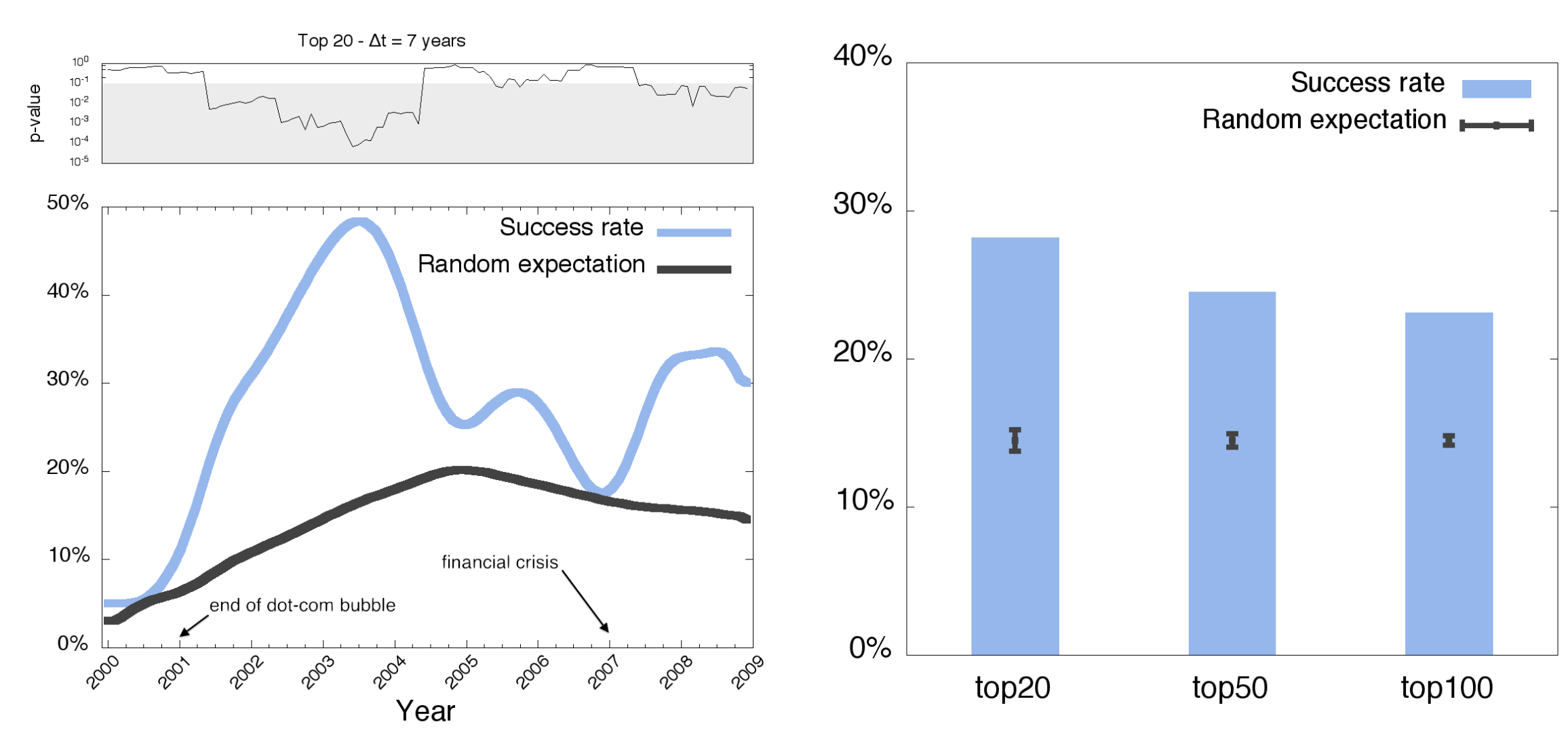 We can imagine the network of startups evolving over time, i.e. new companies and connections are forged over time as people move from one company to another. To test if we are able to highlight a set of successful companies from this network, we simulated a decision process every historical month. For every monthly snapshot of the network, we consider only those companies that existed at that point in time. We rank companies based on their closeness centrality, a network measure that quantifies how well connected a node in the network based on its average distance from all the other nodes. From this ranking we keep all early-stage companies only, i.e. those companies that are less than 2 years old, that did not receive any form of funding, and that have not reached any form of success. Every month, we evaluate a selection policy based on the top 20 early-stage companies and the fraction of which reached a successful outcome within 7 years from the ranking date. By a successful outcome here we mean the achievement of at least one of the following: being acquired, acquiring another company, going public via an IPO.