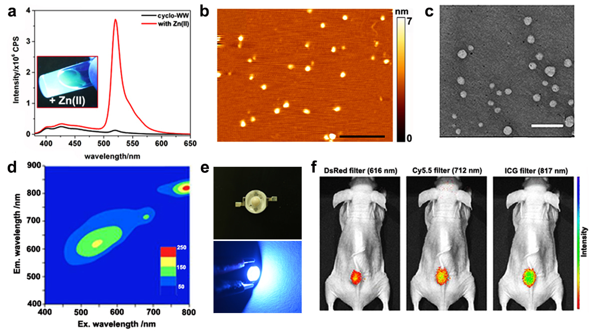 Figure 1. Quantum confined, photoluminescent aromatic cyclo-dipeptide self-assemblies for optoelectric and bio-imaging applications. a, Fluorescent emission spectra of cyclo-WW and cyclo-WW+Zn(II) in MeOH. Inset: a picture of cyclo-WW+Zn(II) in MeOH solution under UV light (365 nm). b, AFM image of the dimeric QDs of cyclo-WW+Zn(II) in MeOH. Scale bar: 500 nm. c, TEM image of the nanospheres self-assembled by cyclo-WW+Zn(II) in DMSO. Scale bar: 300 nm. d, Emission vs. excitation profile of the nanospheres. e, Photographic pictures showing the LED setup under normal light (upper panel) and working status (lower panel) using dried cyclo-WW+Zn(II) assembled in MeOH as phosphors. The bright green light was emitted when inputting voltage. f, In vivo whole body NIR fluorescent imaging following subcutaneous injection of the cyclo-WW+Zn(II) nanospheres in DMSO (50 μL, 2.7 mM) into nude mice, showing notable emissions under various excitations.