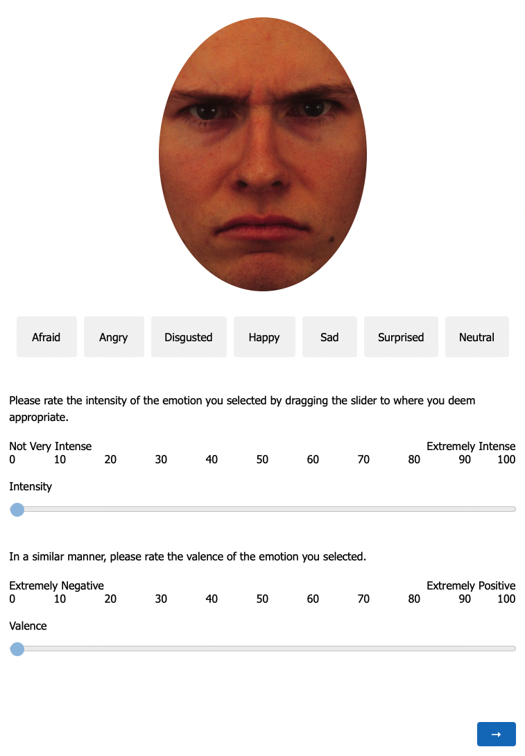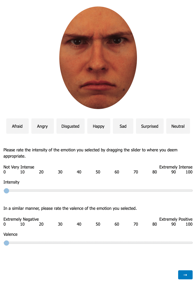 - Emotional valence ratings (the extent and direction of perceived affect in relation to intrinsic appeal or repulsion) six cross-cultural facial expressions of emotion.