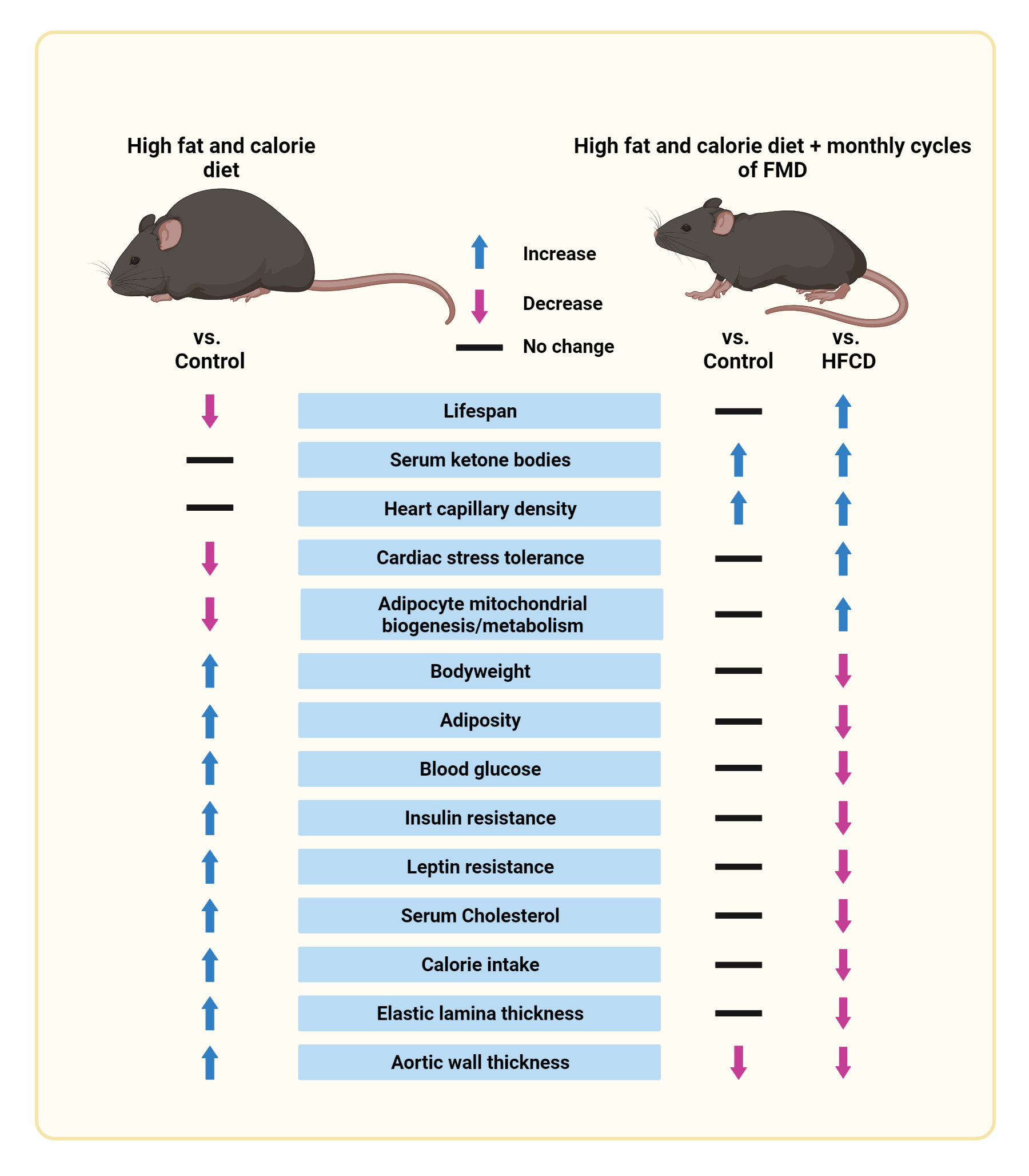 FMD restores lifespan and a range of physiological and metabolic parameters in HFCD fed mice to a level similar to control mice. Illustration from Mishra et al., 2021. https://www.nature.com/articles/s42255-021-00469-6
