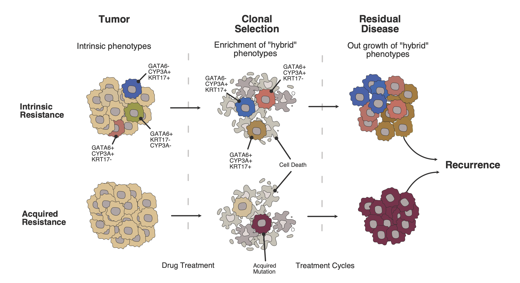 The mechanisms of primary and acquired PDAC resistance to chemotherapy are not yet well understood, but it is now clear that transcriptional tumor subtypes with different levels of chemotherapy resistance exist1,2. It has been difficult to study acquired resistance since tumor biopsies are usually only taken at the time of diagnosis, but not repeated longitudinally during the course of the disease – progression or ‘cure’.