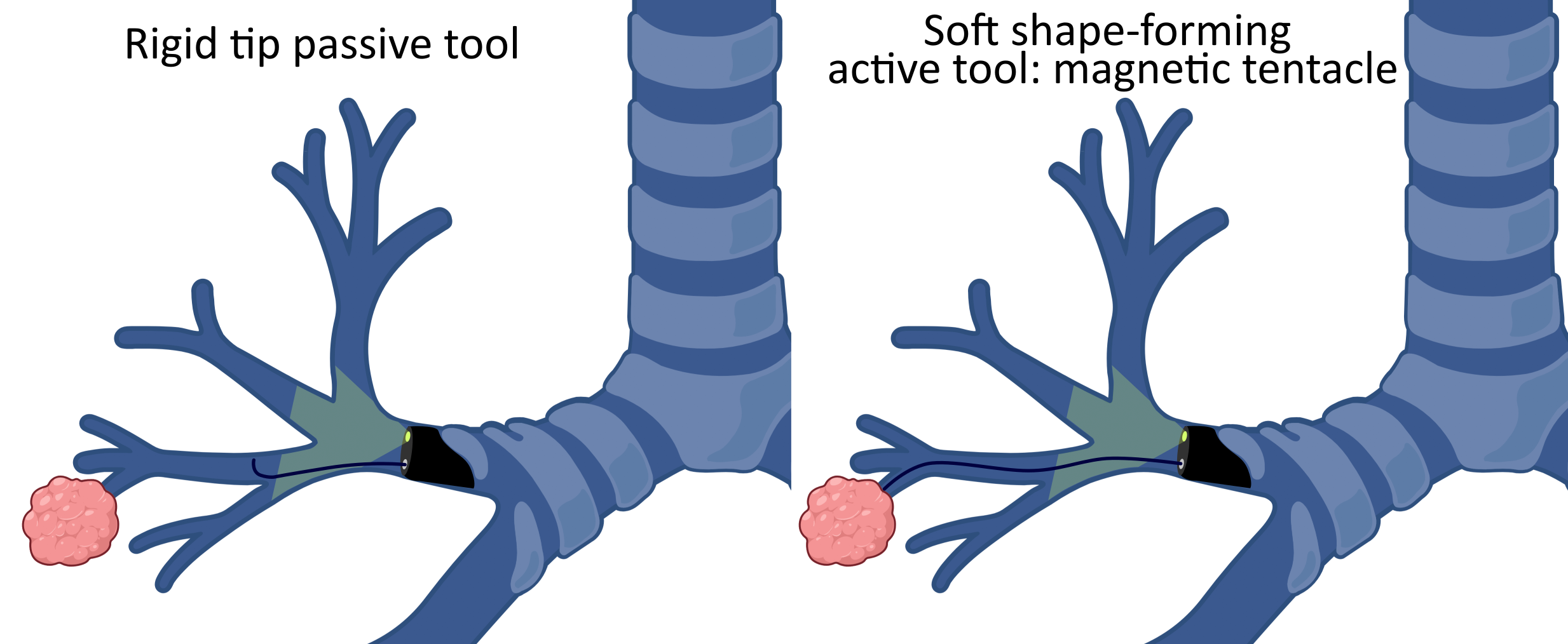 Traditional access to lung cancer is often required for diagnosis (e.g. tissue biopsy) or therapy. This can be performed percutaneously using rigid needles or using a semi-rigid endoscope (bronchoscope) and specialized tools, to navigate through the bronchial tree. While using a bronchoscope (bronchoscopy) offers certain advantages, such as avoiding pleural membrane puncture, its limited reach due to the size of the bronchoscope restricts access to deeper anatomical regions. To overcome this limitation, Electro-Magnetic Navigation (EMN) techniques have been employed, allowing surgeons to navigate within the bronchial tree based on preoperative CT scans, and leveraging intra-operative fluoroscopy. However, the rigidity, size, and pre-bent shape of EMN tools often hinder accurate targeting of tumors due to poor conformation to deformed anatomy.