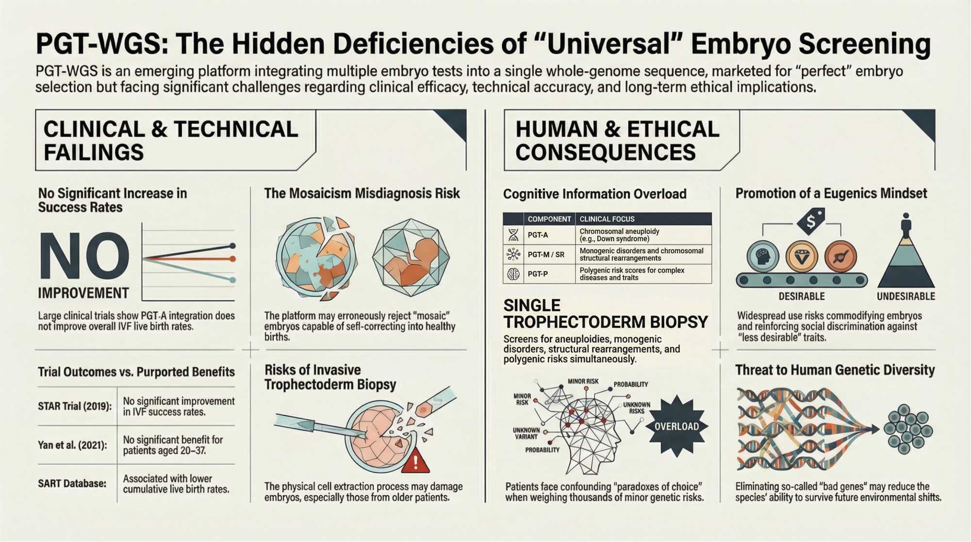 - Misdiagnosis of Mosaicism: Many human embryos exhibit mosaicism (a mix of normal and abnormal cells), and PGT-WGS may lead to the erroneous rejection of these embryos. Evidence suggests mosaic embryos can "self-correct," and discarding them can significantly lower IVF success rates, especially for older women with few embryos