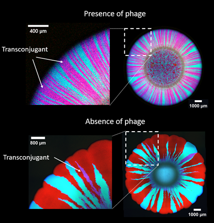 We demonstrated this principle using two strains of Escherichia coli as a model system and conducted experiments to demonstrate that phage predation facilitated more cell-cell contacts by decelerating the spatial separation between the strains as they grew across space during microbial community growth and expansion. This increase in cell-cell contact numbers directly enhanced plasmid transfer efficiency mediated by conjugation, allowing antibiotic resistance genes to spread more widely within our experimental system.