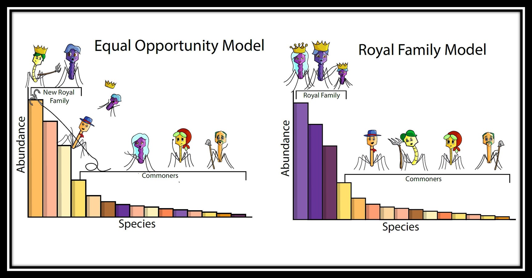 In this model, the royal family, which is distinct in different areas (“kingdoms”) is composed of the dominant bacterial and phage populations, while all the other phages and hosts comprise the commoners. We hypothesize that members of the royal family are abundant because they are optimized to that niche, and upon death of the ruling bacterial monarch and subsequent decline in abundance of its phages, the next ruler is likely to be a descendent of the royal family that has acquired resistance to its dominant phage predators, as opposed to a commoner that scaled the steep rank-abundance plot to rise to rule. Alternatively, in the equal opportunity model, all hosts and their respective phages would have an equal chance to fill the empty niche. While future work is needed to examine phage and host succession in the oceans, initial evidence appears to support the royal family model, where hosts who are well-suited for the niche remain in power. This arms-race between interacting phage-host pairs is seen as fine-scale microdiversity changes, while coarse-scale diversity (such as that measured by conserved genetic targets) remains relatively unchanged. So the next time you take a dip in the sea, remember – you’re among royalty!
