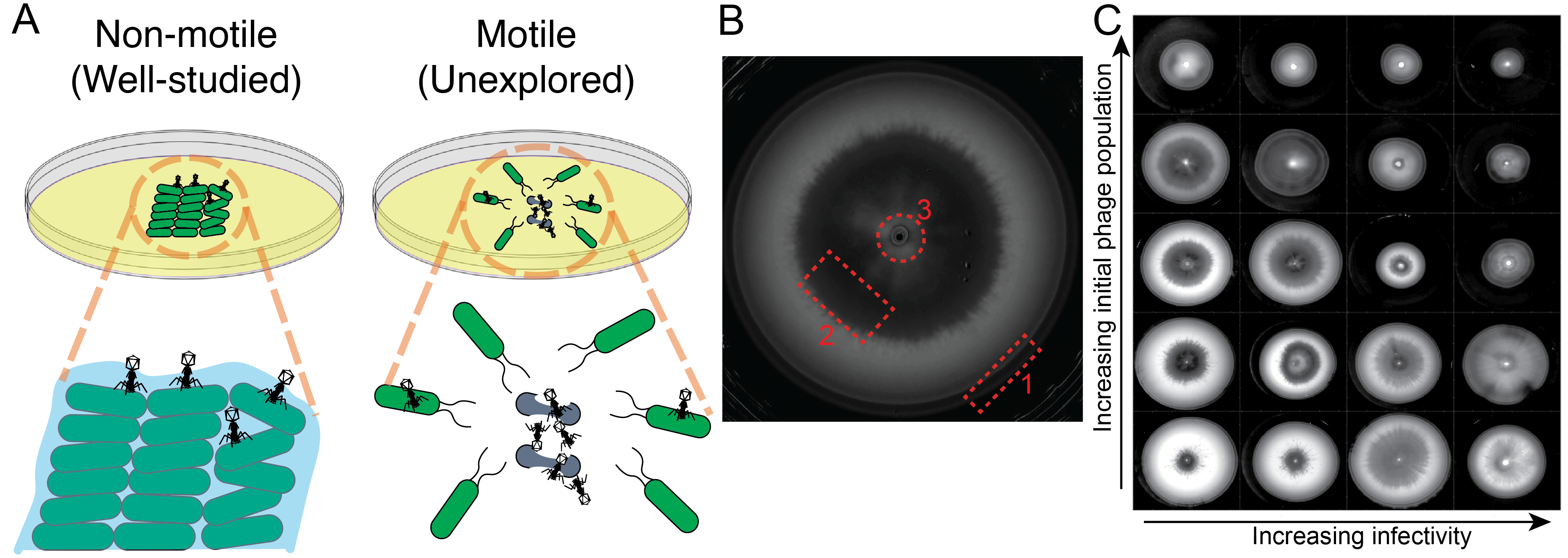 The idea behind this project came from a casual meeting between three coauthors: Seppe Kuehn who studied how chemotactic E. coli evolve faster migration (eLife, 2017) and Kim Sneppen and Sergei Maslov who are long-time collaborators with a keen interest in phage. A question naturally emerged: how do phages infect chemotactic bacteria? In the past, studies of phage infection in space focused on what happens in the bacterial lawns or biofilms (Fig. 1 A, left). Those studies shed light on how phage attack non-motile bacteria. Surprisingly, how phage infects and coexists with moving bacterial populations was largely unexplored. To study this question, Derek Ping, an undergraduate student from Seppe’s lab, performed experiments by inoculating the chemotactic E. coli cells together with their phage P1vir at the center of an agar plate with rich medium (Fig. 1A, right).