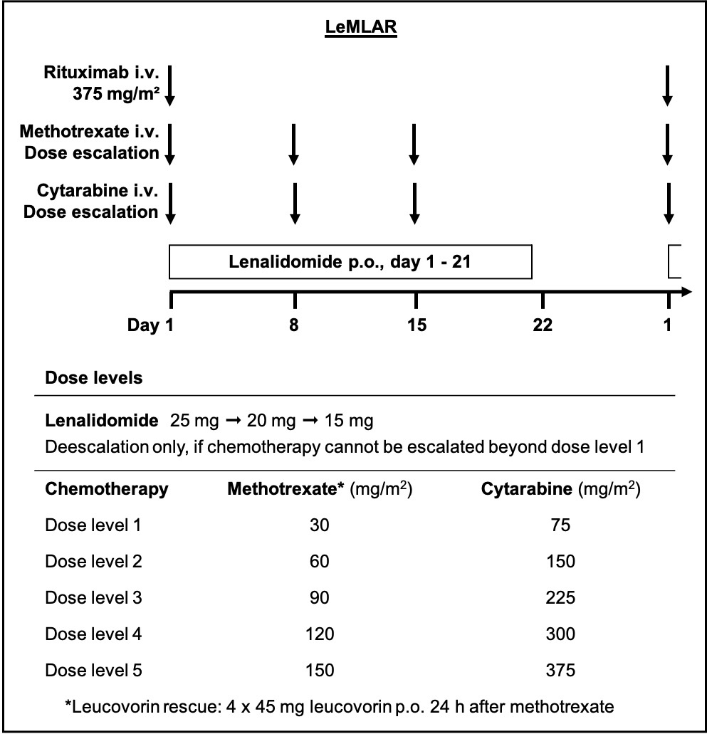 Based on the kinetic model underlying the COMLA regimen, we combined lenalidomide with methotrexate, leucovorin, cytarabine, and rituximab (LeMLAR) in a phase I/II trial including 34 patients (median prior lines of therapy, 2; range, 1-4). Dose-limiting toxicity was determined in cycles 1 and 2, and dose escalation was allowed in cycles 3-6 of a maximum of six 28-day cycles.