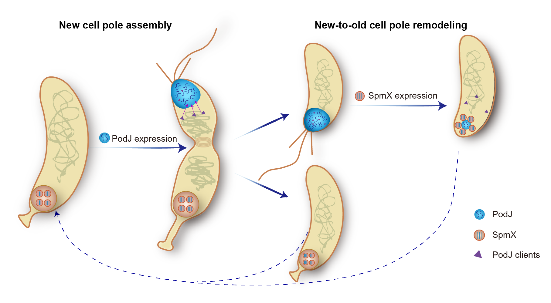 Scaffold proteins are known to physically tether client proteins to specific cellular areas, functioning in spatial regulation of biological processes including signaling transduction, cytokinesis, morphogenesis, and ACD. In C. crescentus, the kinase DivJ is recruited to the stalked cell pole (old cell pole) through a PopZ-SpmX-DivJ sandwich, while the phosphatase PleC is localized to the swarmer cell pole (new cell pole) by the PodJ scaffold.