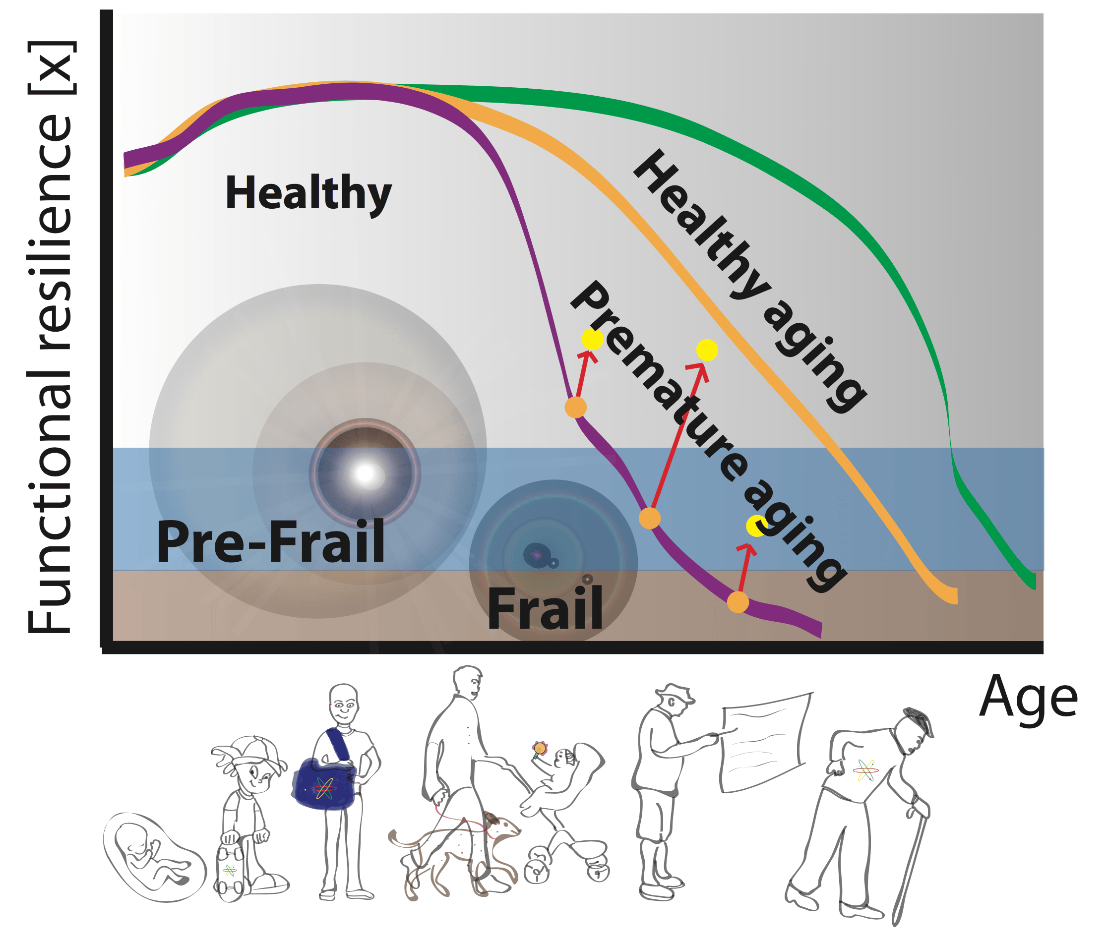 slowed (green), with delineations of pre-frail and frail regimes. Arrows illustrate the potential for clinical-course