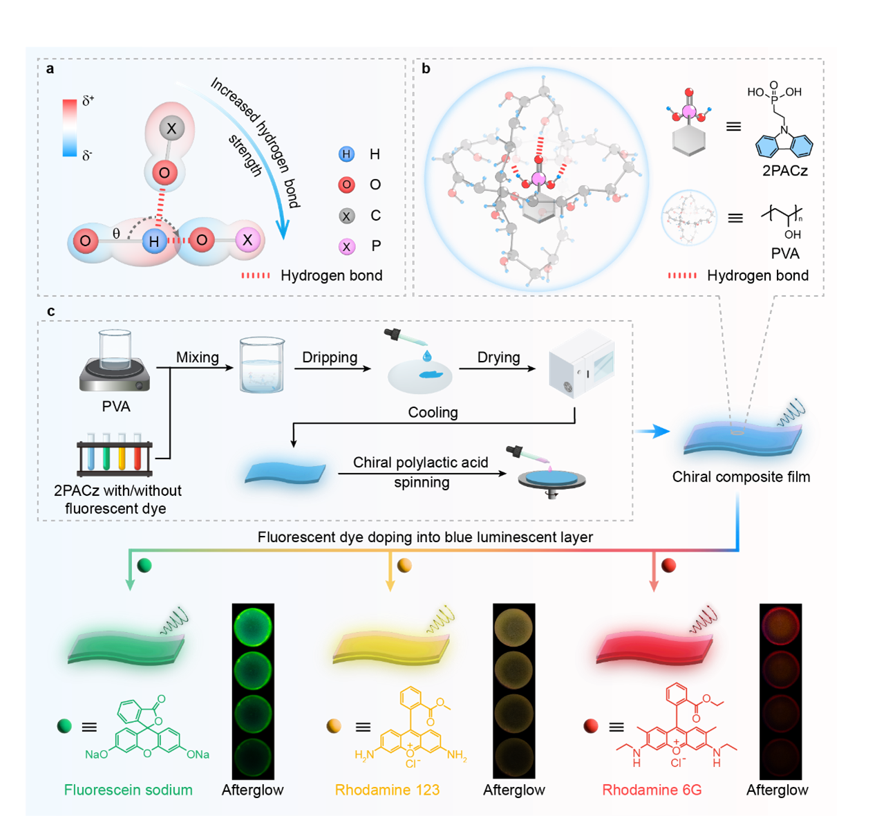 Fig. 1 | Schematic diagram for constructing multi-color chiral organic afterglow (COA) by hydrogen bond mediation and phosphorescence energy transfer. a Principle drawing for hydrogen bond strength mediation through modulating electronegativity of hydrogen bond acceptor and spatial arrangement of hydrogen bond. b Formation of a three-dimensional hydrogen bond network mediated by phosphorus in polyvinyl alcohol (PVA) film and the molecular structure of 2PACz and PVA. c Preparation procedure and corresponding afterglow photographs of multi-color COA films, as well as the molecular structures of the incorporated multi-color fluorescence emitters.