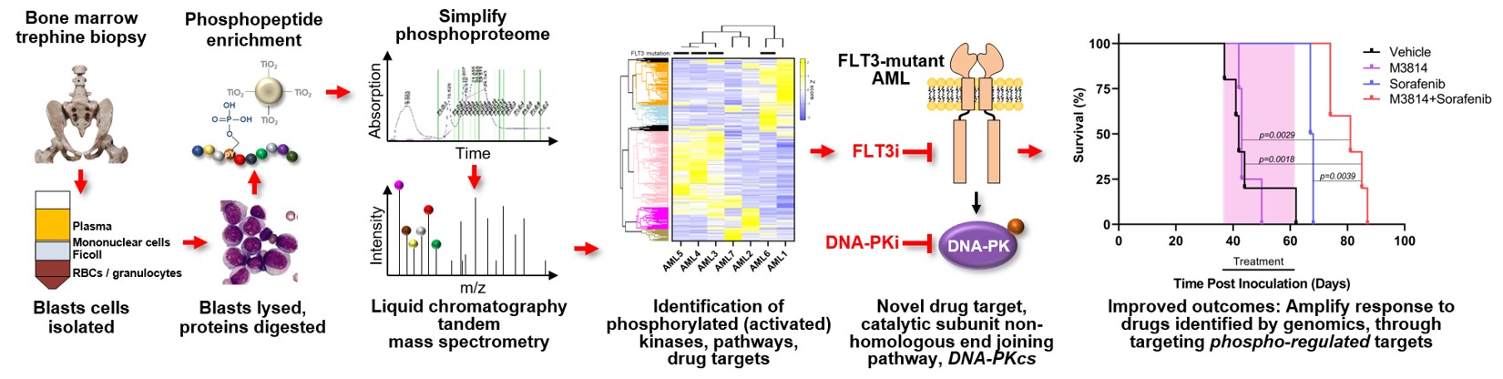 Workflow used to identify drug targets invisible to genomics approaches – phosphoproteomic profiling of AML blasts.