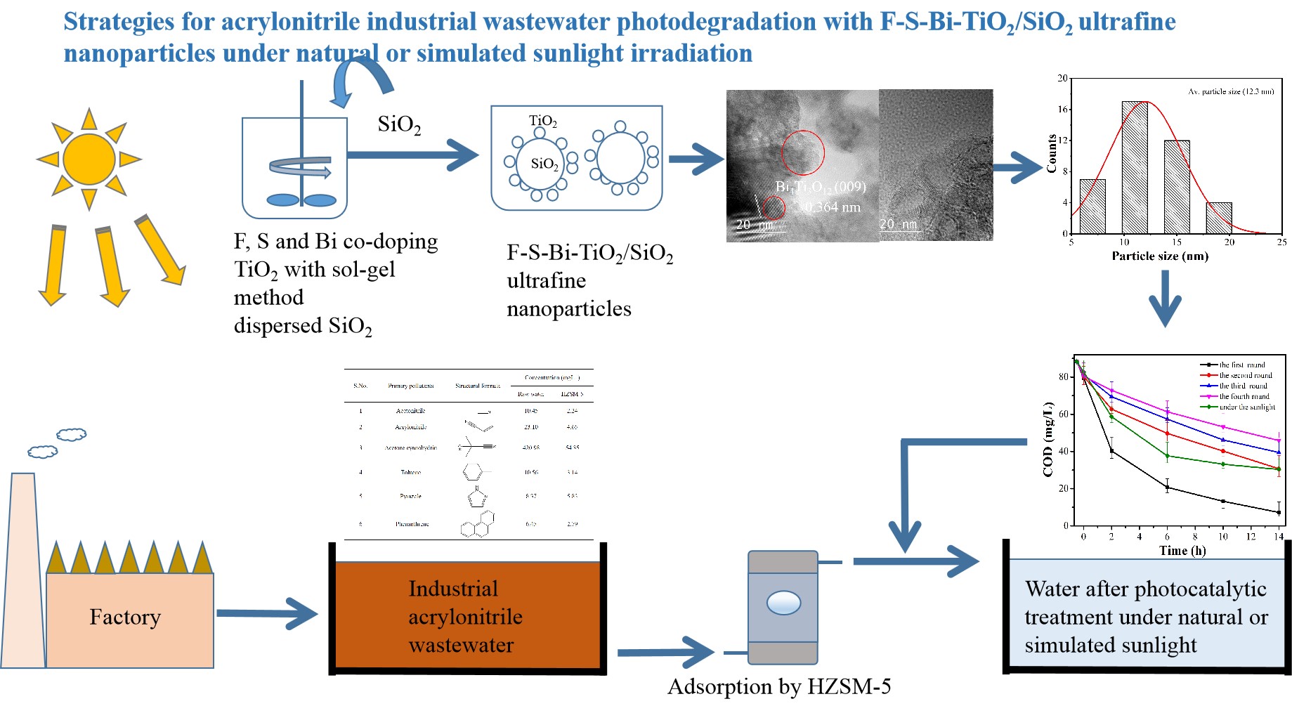 Various methods have been reported for the treatment of acrylonitrile wastewater, among those methods photocatalysis acquired much attention over the past decade. Since, photocatalytic reaction under sunlight irradiation is more energy-advantageous, and a lot of researchers have made vast efforts to realize the industrialization of photocatalytic treatment of industrial wastewater under sunlight. However, there were few successful reports under sunlight because of the complexity of industrial wastewater. Thus, photocatalytic treatment of industrial wastewater under sunlight was a great challenge for the researchers.