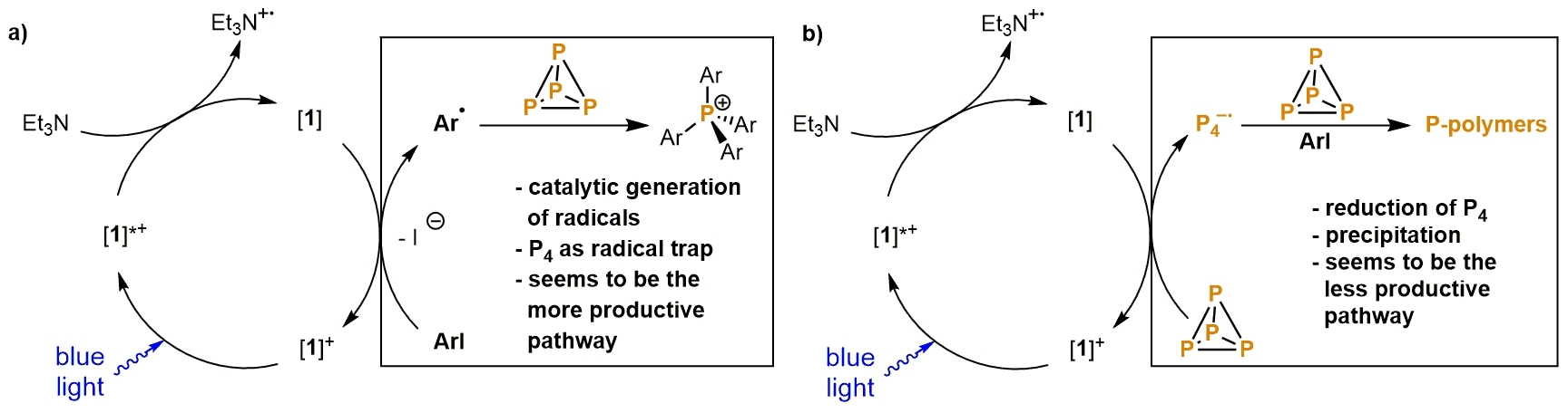 With this idea in mind we began the project, and tried to employ several well-established and well-known photocatalytic systems. Unfortunately, while P4 was consumed in almost all cases, controlling its reactivity proved challenging. In fact, most 31P{1H} NMR spectra and GC-MS analyses did not show any phosphorus containing compounds at all! Instead, a precipitate was almost always formed, and we realised that P4 was probably being reduced directly by the photocatalyst to form the anion P4∙, which then induces polymerization of further P4 (see Fig.1b). Nevertheless, we persisted in our investigation, and were ultimately rewarded with the discovery that using [Ir(dtbby)(ppy)2]PF6 ([1]PF6) as catalyst and Et3N as electron donor solved our problem. The in-situ formed reduced photocatalyst [1] preferentially dehalogenates iodobenzene derivatives to form the desired carbon-centered radicals, and only traces of P4 seem to be reduced. Thus, irradiation of a solution containing [1]+, triethylamine, iodobenzene and P4 in a benzene/acetonitrile mixture with blue LEDs yielded the corresponding tetraarylphosphonium salt, [Ph4P]I. Moreover, substrate screening showed that differently-substituted triarylphosphines and tetraarylphosphonium salts could be synthesized by this method. With these results we were able to validate our reaction design principle, and to demonstrate the first example of an effective catalytic system for the direct organofunctionalisation of P4.