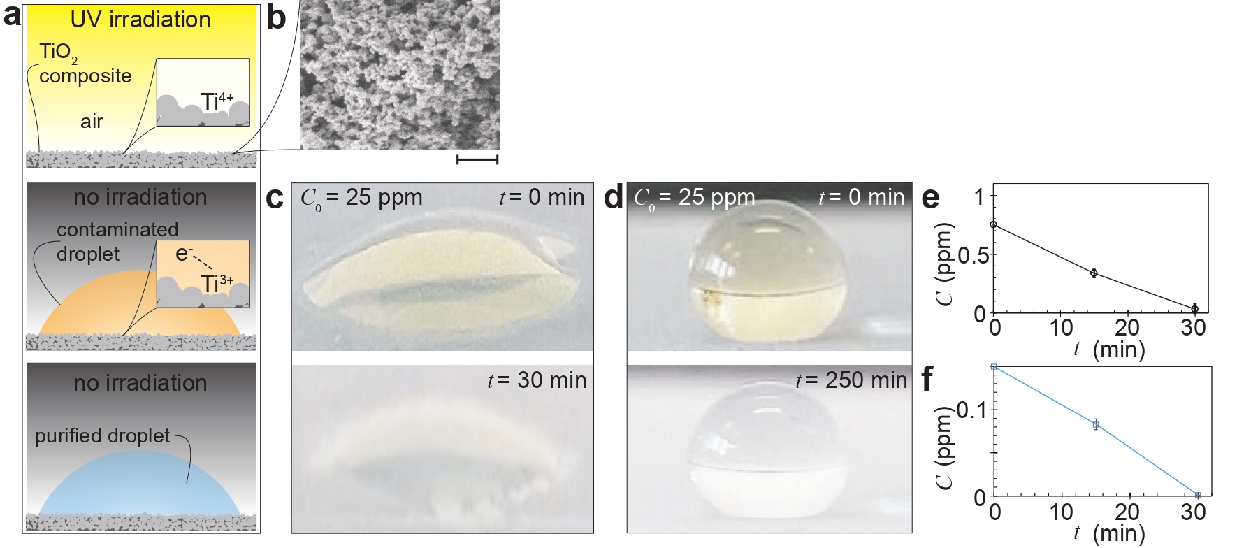 Figure 1. Reactive coatings that purify with intermittent UV irradiation. (a) Schematic showing the working principle of the coating. (b) Scanning electron microscopy, scale bar 200 nm. Image sequences showing how the (c) hydrophilic and (d) hydrophobic reactive coatings can treat contaminated water droplets (dispensed droplet size 5µl). (e) The plot of C vs. t (black line with circular markers) for diesel dispersed in water and placed on the pre-activated hydrophilic surface. (f) Plot of C vs. t (blue line with square markers) for bisphenol A-water solution on a similar pre-activated hydrophilic surface.