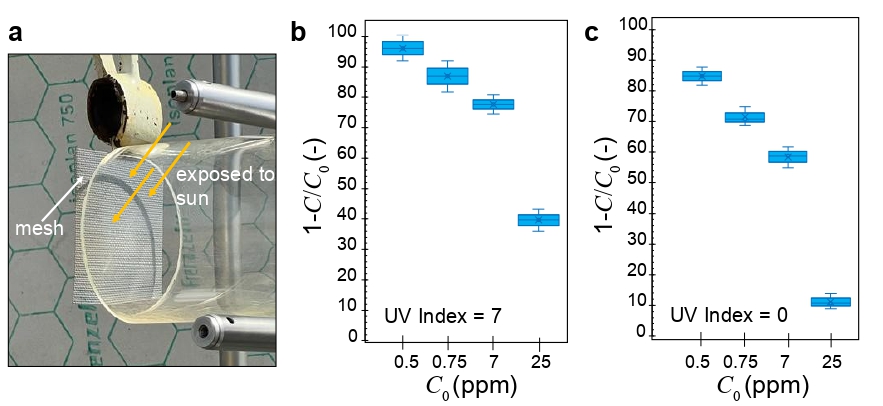 Here we show the possibility of harvesting fog water and also instantaneously treating the water on the surface of the fibers/ meshes. Inspired from previous work that used anatase TiO2, the most photocatalytically active phase, to clean surface contaminants and microbial organic deposits, we coat the surfaces with anatase TiO2 nanoparticles. Certain metal oxides known as photocatalysts like TiO2 when irradiated with a specific wavelength of light, which for TiO2 is ultraviolet light, causes defects in the lattice which drives the catalytic decay reaction, Figure 1(a). We embedded the TiO2 nanoparticles in polymer coatings on mesh wire surfaces (Figure 1(b)) and developed a combined fog harvesting and water purification device that operates outdoors completely passively, requiring sunlight only for activation. What is fascinating about the study is that the coating remains reactive even when not irradiated for several hours, enabling one to simultaneously collect and treat polluted fog even when solar irradiance is low as it would be under foggy conditions. This showcased the possibility of applying the concept in a real-world environment to passively remove a range of pollutants.
