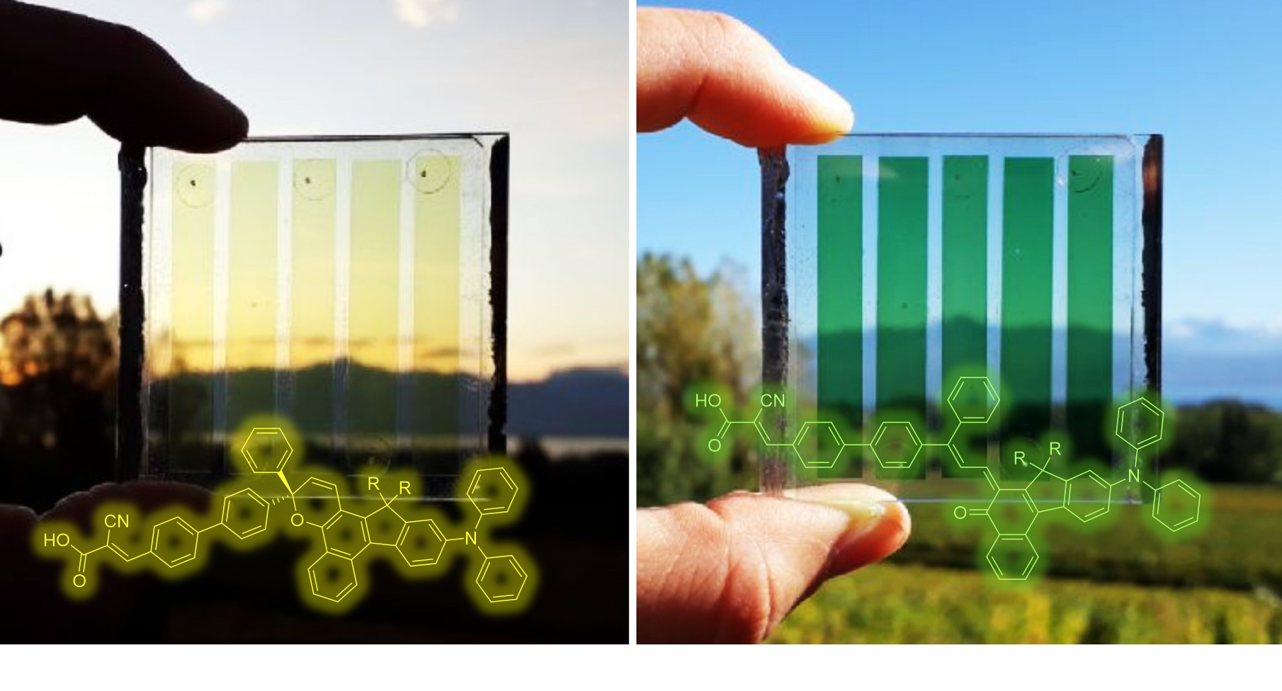 With my team, we developed a family of molecules embedding a photochromic naphthopyran core in a push-pull type dye structure. Theoretical modelling and calculations drove the orientation of the naphthopyran unit with the structure and its substitution. After synthesis, we used the dyes as photosensitizers and fabricated DSSCs. Immediately we got solar cells that can vary their colours, and simultaneously adapt their light transmission and PCE with the irradiation conditions.