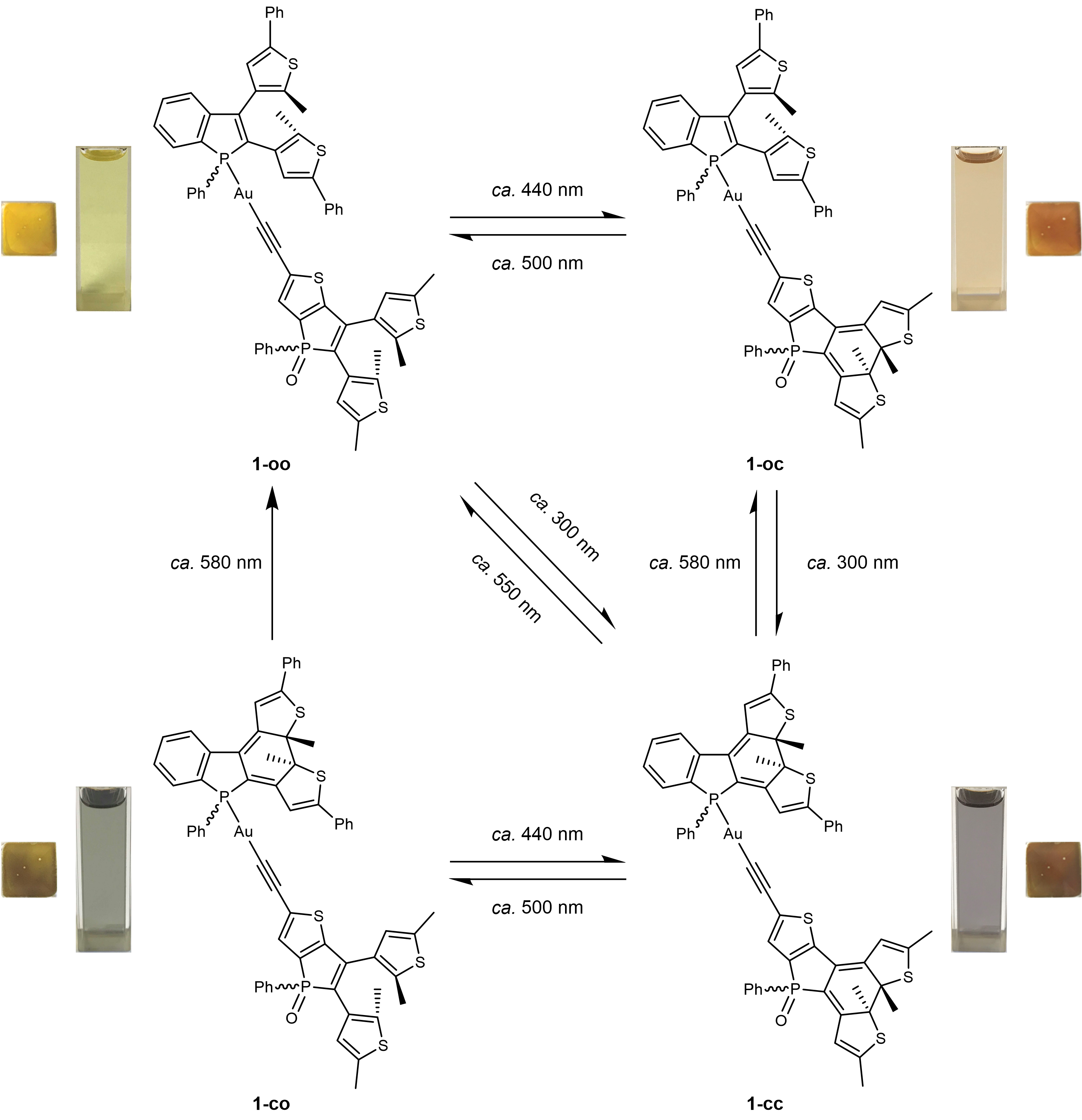 Although a few examples of photochromic systems have shown multiple photochromism,20-24 they are usually realized by the simultaneous photocyclization reactions of all open form moieties non-selectively upon UV excitation, followed by subsequent photocycloreversion reactions of each closed form unit. We would like to achieve a selective and versatile control of a photocyclization reaction of the desired open form unit in an exclusive manner. The benzo[b]phosphole thieno[3,2‑b]phosphole-containing alkynylgold(I) complex 1 has been successfully synthesized to display multiple photoinduced color changes upon selective photoexcitation of light at specific wavelengths (Figure 2). A single photocyclization reaction of the visible light-driven open form of the thieno[3,2‑b]phosphole ligand (1-oo → 1-oc), with the color changes from yellow to orange, has been triggered exclusively by the irradiation of visible light at ca. 440 nm. Upon UV excitation, the UV-driven open form of the benzo[b]phosphole ligand would undergo photocyclization (1-oc → 1-cc), with color changes from orange to purplish grey. Photocycloreversion of the closed form of the thieno[3,2‑b]phosphole unit (1-cc → 1-co), with the color changes from purplish grey to greenish grey, would take place by photoirradiation at ca. 500 nm. Upon further photoirradiation at ca. 580 nm, the photocycloreversion of the closed form of the benzo[b]phosphole unit (1-co → 1-oo) would take place, with a recovery of the yellow color from the greenish grey color, returning the gold(I) complex back to its open form (1-oo). Therefore, four isomers of 1-oo, 1-oc, 1-cc and 1-co with different colors could be obtained via the stepwise photochromic reactions. On the other hand, both the open forms of benzo[b]phosphole and thieno[3,2‑b]phosphole ligands could undergo simultaneous photocyclization reactions upon UV excitation (1-oo → 1-cc), indicated by the color changes from yellow to purplish grey. However, shining visible light at ca. 550 nm on the closed forms could lead to complete photocycloreversion reactions (1-cc → 1-oo), featuring photoinduced color changes from purplish grey to yellow. The whole processes of each photocyclization and photocycloreversion reactions have been monitored by 1H and 31P{1H} NMR and UV-vis absorption spectroscopy. Moreover, this benzo[b]phosphole thieno[3,2‑b]phosphole-containing alkynylgold(I) complex has also been found to feature promising photochromic behaviors such as excellent thermal irreversibility even at high temperature, robust fatigue resistance at ambient condition, high conversion of the closed forms at the photostationary state (PSS) and relatively decent photoswitching efficiency.