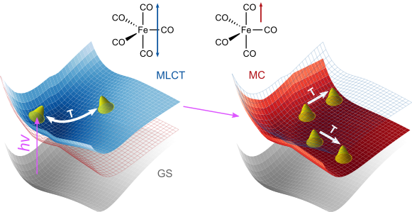 Photoexcitation of the ironpentacarbonyl complex from the electronic ground state (GS) into a metal-to-ligand charge-transfer (MLCT) state triggers Fe-CO oscillations, which after electronic rearrangement into a metal-centered state (MC) lead to periodic bursts of carbonmonooxide (CO).