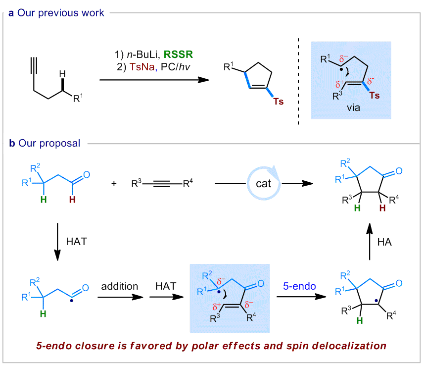 [3+2] Annulation is a powerful strategy for the fast assembly of five-membered rings. Specifically, the 1,3-dipolar cycloaddition of C-C double bonds has been widely developed for the synthesis of cyclopentanones. However, the radical [3+2] carbocyclization of alkynes, featuring the C-C bond formation on inert C-H bonds, is still a formidable challenge, due to the lack of suitable three-carbon (3C) building blocks and unfavorable 5-endo-trig closure. In light of recent developments on decatungstate-catalyzed C-H functionalization of aldehydes and our interest on 5-endo-trig radical cyclization, we envisioned that aliphatic aldehydes could be exploited as an ideal 3C component for the [3+2] carbocyclization of alkynes via hydrogen atom transfer (HAT)-induced double C-H functionalization (Fig. 2b). The polar effects and radical delocalization, both caused by the adjacent carbonyl group, may facilitate the 5-endo-trig radical closure.