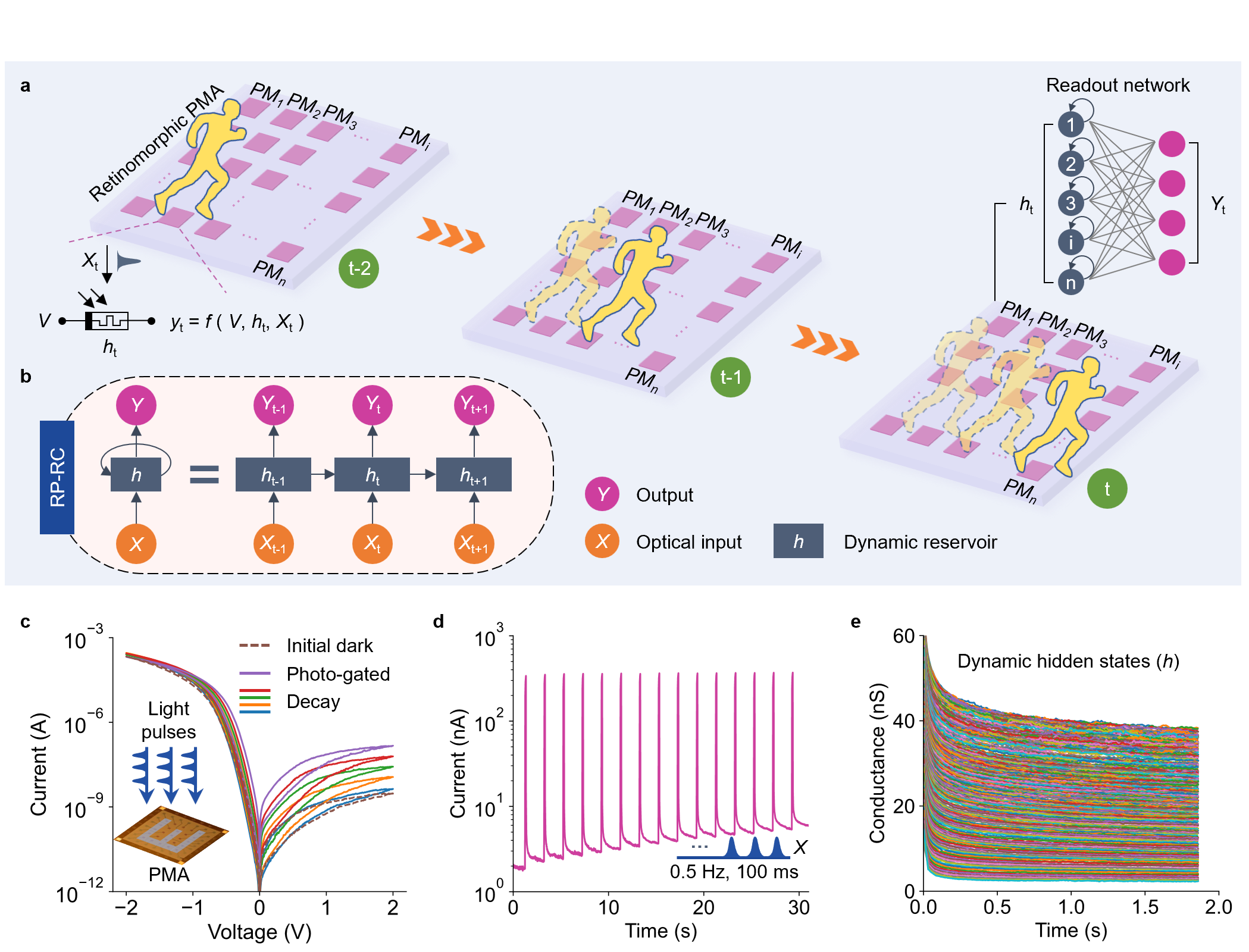 In the retinomorphic photomemristor-reservoir computing system (Fig. 1b), the inherent dynamic memory (Fig. 1c-e) of the photomemristor networks stores spatiotemporal information of a frame-by-frame visual sequence as hidden states (h) in the last frame (Fig. 1a). The dynamic photomemristor networks reservoir, containing all the past spatiotemporal visual information, is used for dynamic processing tasks through the training of readout networks.