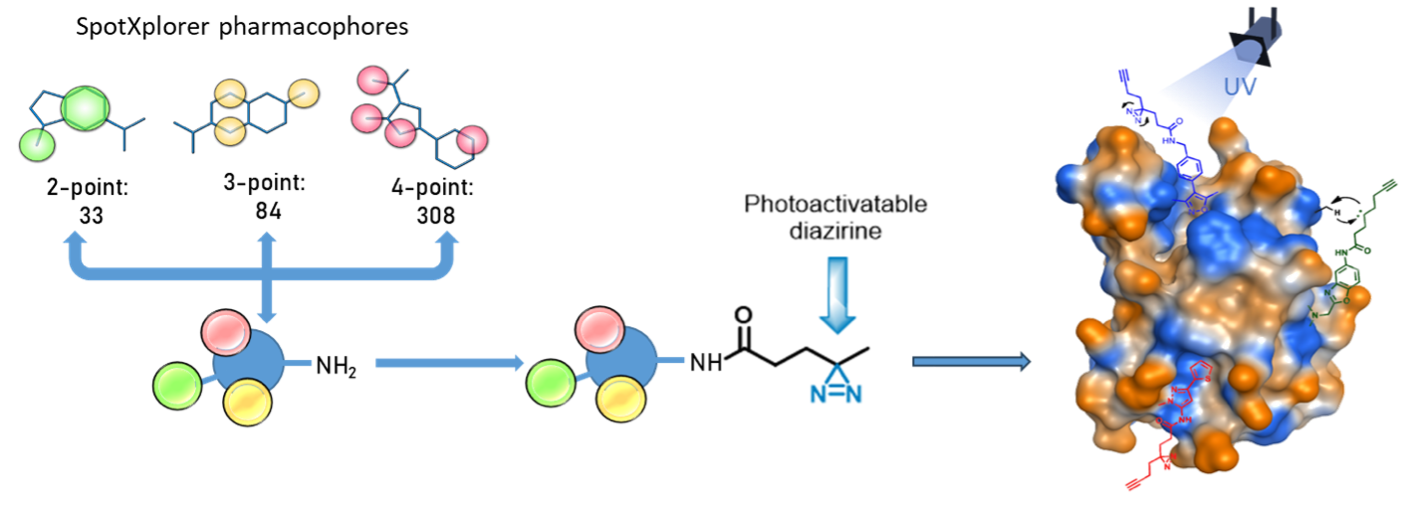 Figure 1. SpotXplorer fragment pharmacophores are tagged by the photoactivable diazirine moiety. The resulting PhotoXplorer fragments are screened against relevant drug targets.