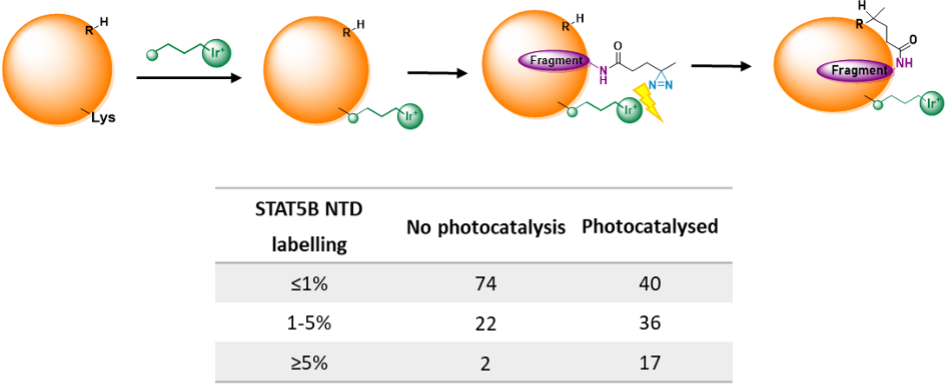 Additionally, to overcome the bottleneck of the diazirine tag’s limited photosensitivity, we have introduced an iridium-based photocatalyst [5]. This catalyst enhances the efficiency of the photoreactive process by facilitating Dexter-energy transfer, which activates the diazirine tag even at lower energy levels. This will ultimately result in increased labelling efficiency, higher overall hit rates and an improved detection sensitivity of the screening platform, making it easier to identify weak binders that might otherwise go undetected. We have successfully showcased this approach by identifying multiple fragment hits against a challenging and yet unliganded oncotarget, the N-terminal domain of the STAT5B transcription factor, where traditional methods had previously failed to identify viable hits (Figure 2).